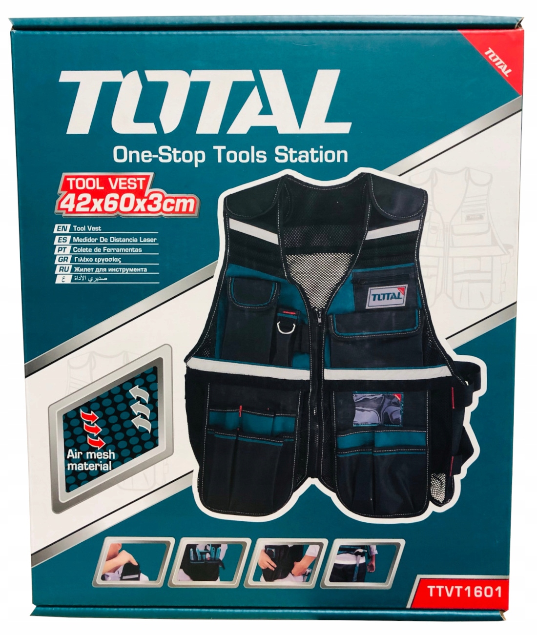 Жилет TOTAL с отделениями для инструментов легкий и прочный, изготовлен из полиэстера. Благодаря этому все инструменты у вас под рукой, а руки остаются свободными.