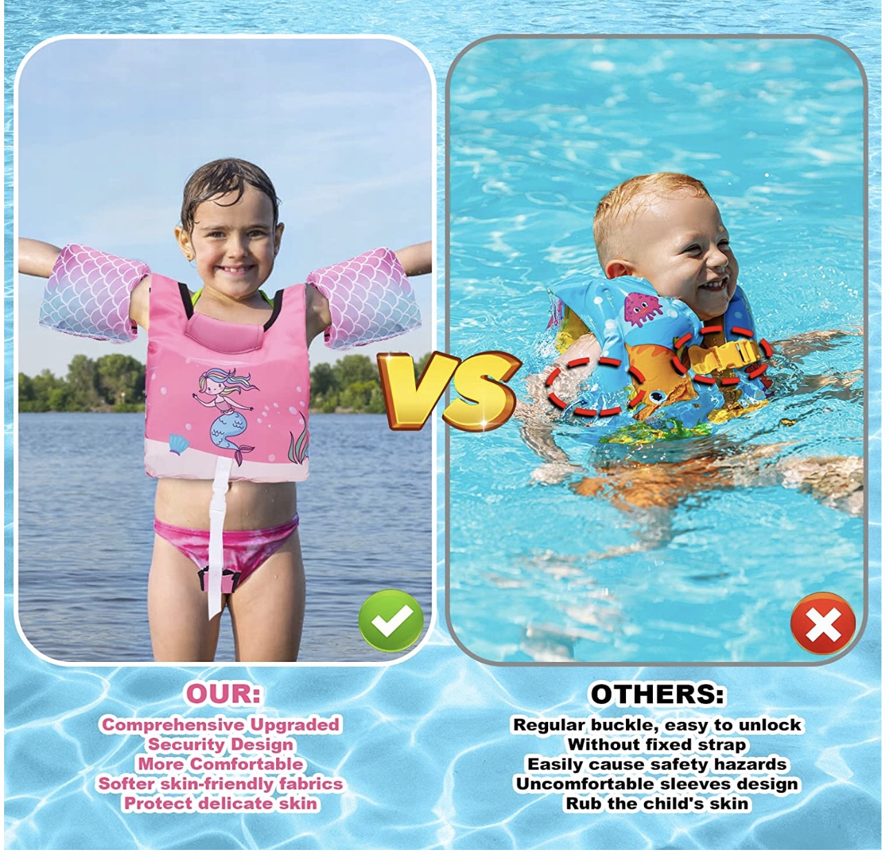 【Безопасный и удобный дизайн】: мы разместили плавучие гидрокостюмы одинакового размера спереди и сзади, чтобы сбалансировать плавучесть и эффективно удерживать детей в воде в вертикальном положении. Кольцо на руку для плавания и соединительный материал жилета мы надеваем прямо на плечи, чтобы не повредить подмышки детей.