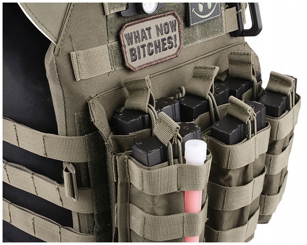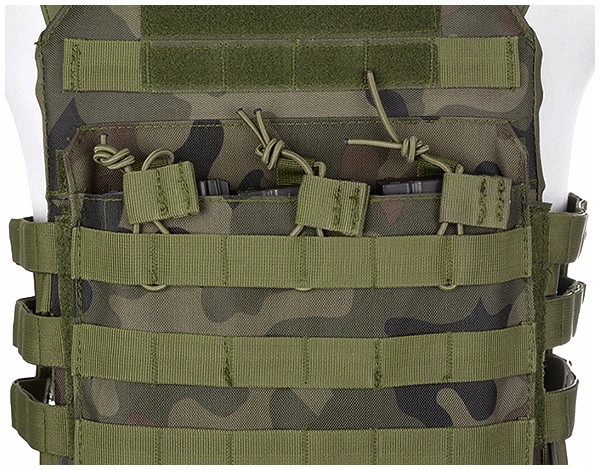 На передней панели пластиноносителя имеется универсальный подсумок, вмещающий 3 М4/М16. магазины., а также типа АК. Резиновые ленты с ручками предохраняют магазины от выпадения и позволяют быстро их извлекать.