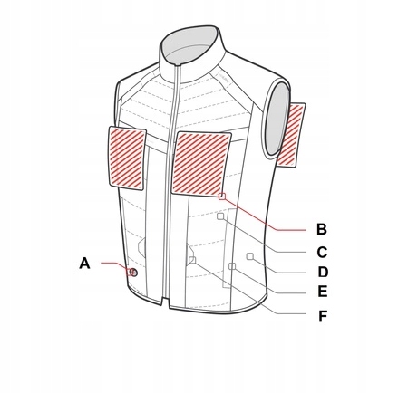 - Жилет предлагает 4 уровня нагрева (высокий 53°C, средний 48°C, низкий 43°C, экономия энергии 38°C), которую можно регулировать с помощью кнопки управления.
