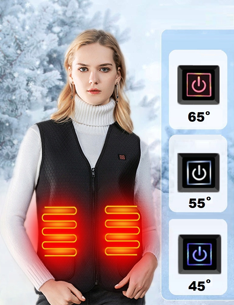 Жилет оснащен однокнопочным светодиодным контроллером, позволяющим регулировать желаемый прогрев благодаря трем уровням температуры.