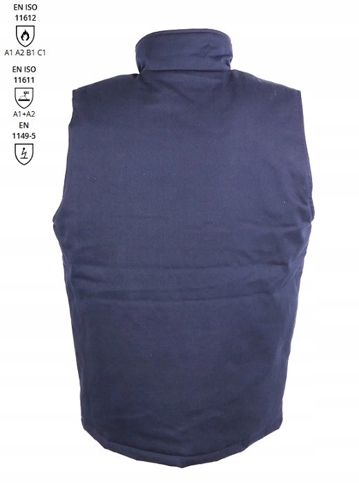 Жилет огнестойкий, огнезащитный. Огнестойкий благодаря составу ткани (хлопок/углерод). Теплая благодаря подкладке (полиэстер). Внешний материал: 98 % хлопок и 2 % карбон, 350 г/м². Подкладка и подкладка из огнестойкого полиэстера. Четыре функциональных внешних кармана.