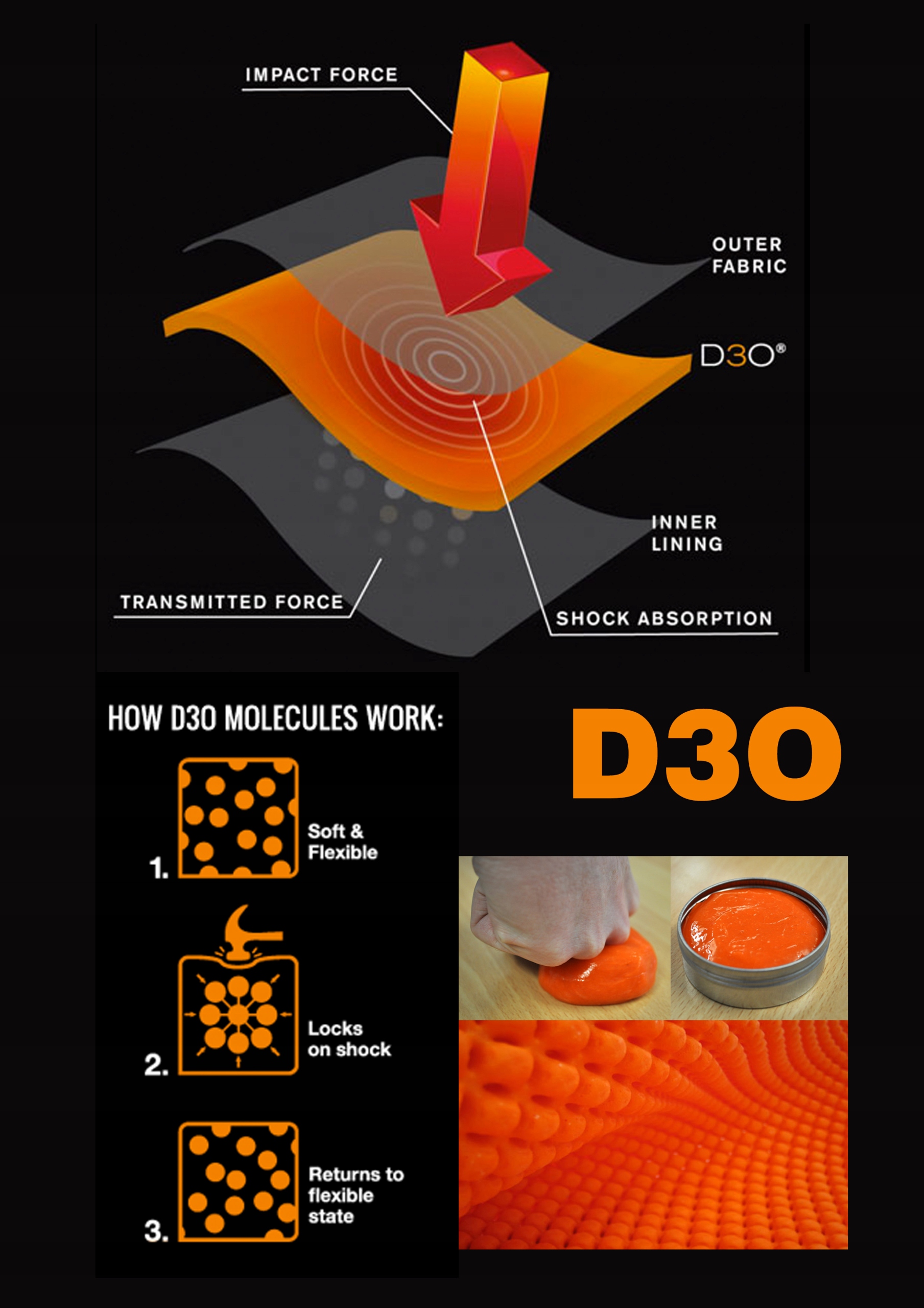 - D3O – разумный материал, являющийся результатом нескольких лет исследований и экспериментов. Полимер D3O состоит из молекул, которые свободно движутся – но в результате сильного удара отдельные молекулы сближаются друг с другом и объединяются. Такая конструкция означает, что протектор остается гибким при ношении, а при ударе затвердевает, создавая защитный слой. D3O имеет в несколько раз лучшие параметры амортизации, чем вдвое более толстый пенополиуретан или пена EVA. Благодаря этому дискомфорт при использовании не возникает – протектор достаточно хорошо адаптируется к телу пользователя и достаточно легкий. Технология D3O используется только в изделиях высочайшего качества, которые призваны минимизировать защиту в случае падений или сильных ударов.