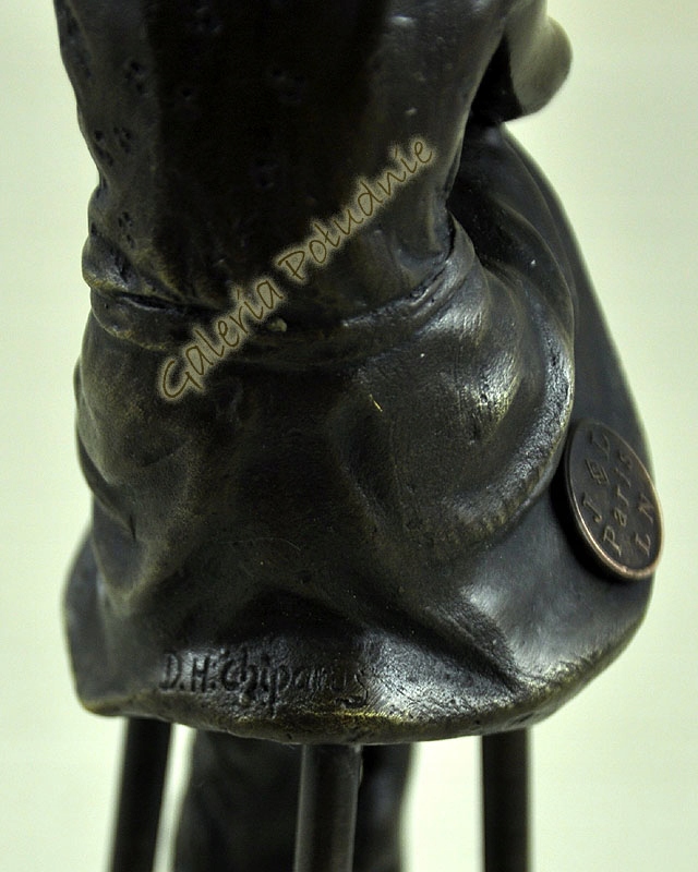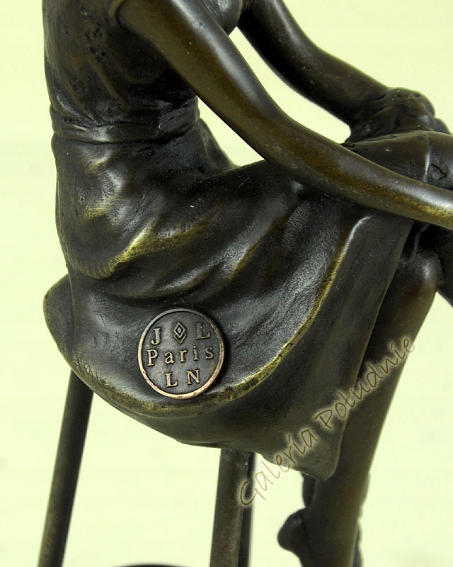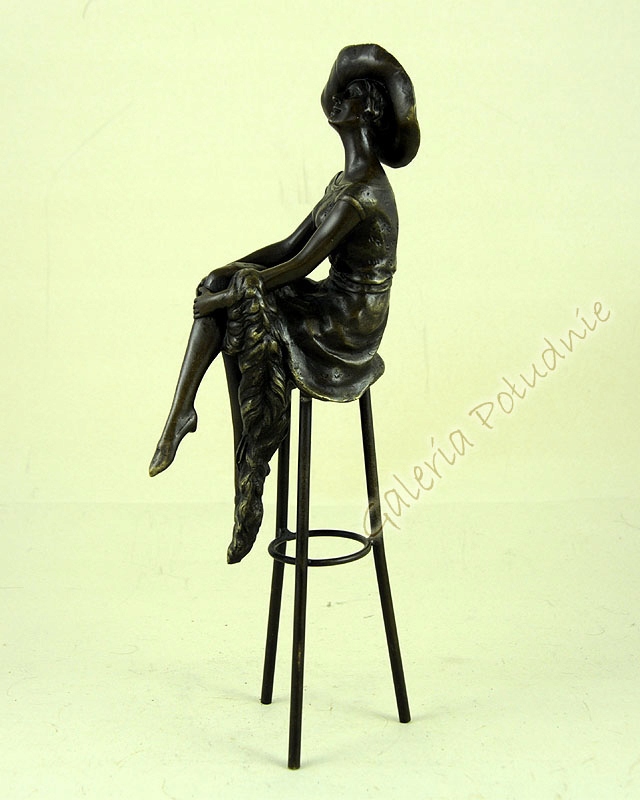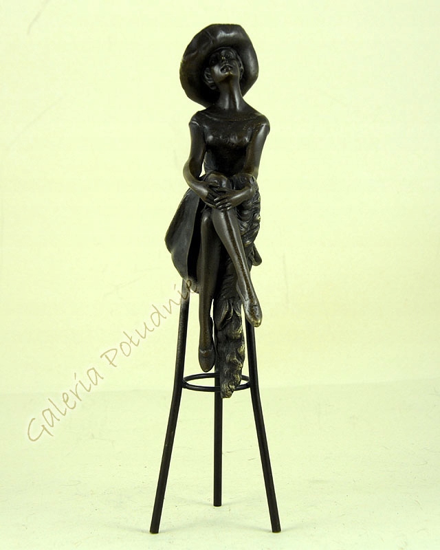 Бронзовая статуэтка, изображающая стройную женщину, сидящую на высоком стульчике, скрестив ноги. Она одета в сексуальное платье, на голове шляпа.Длинные три ножки стула соединены овальным кольцом, идеально подчеркивающим сидящую женщину. Интересная статуэтка, представляющая собой украшение, которое поместится даже на небольшой поверхности.