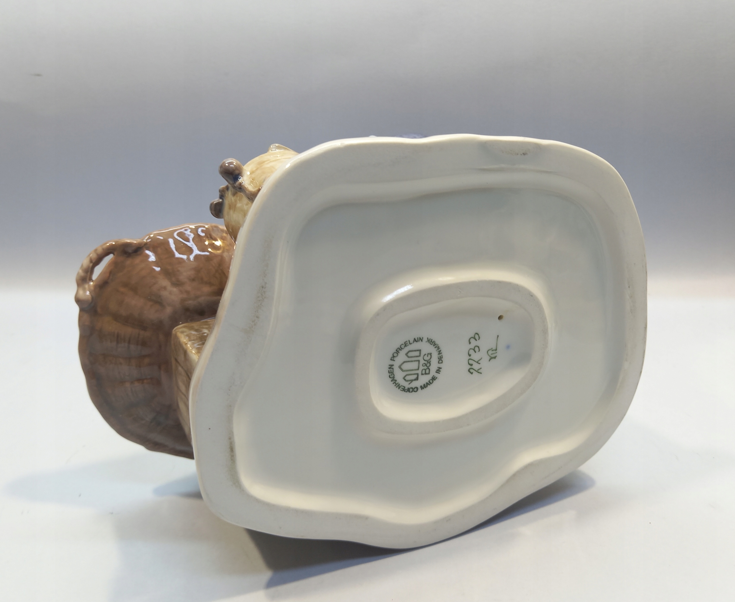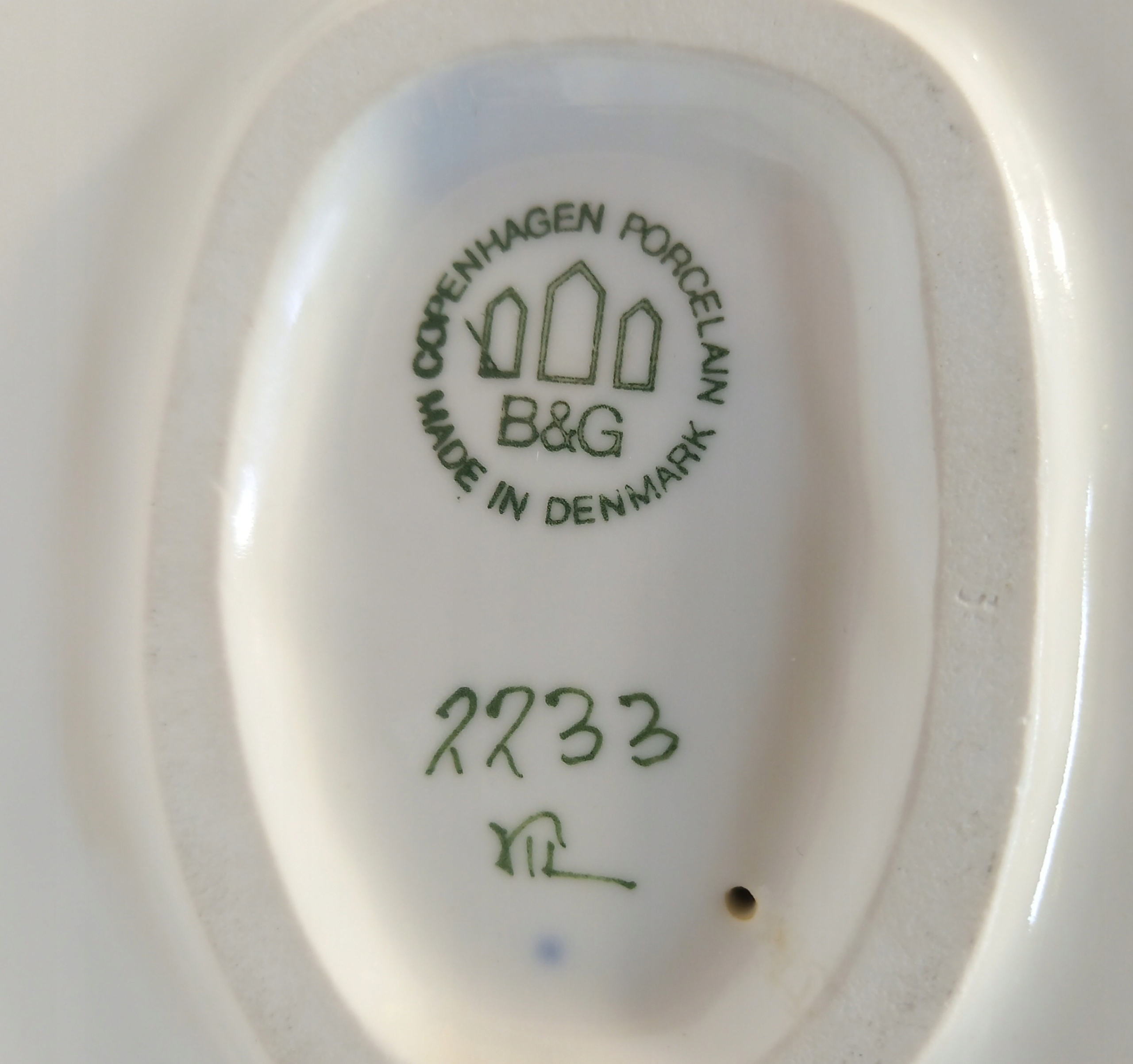 Подписи: B&G Kjobenhavn Дания, использовалась в 1970–1983 годах/ b>рукопись, надглазурная, с модельным номером 2233 и монограммой декоратора. По краю постамента массивное оттиск «Акселя Лохера».