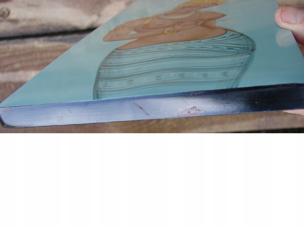 изображение показывает картину в индийском или непальском стиле, показывающая женскую фигуру. Женщина изображена с верхней частью тела в декоративном головном уборе и ювелирных изделиях, держащих в руке цветок. Фон изображения равномерный в голубом цвете боковых сторон границы. : Высота 35, 5 см x Ширина 15 см x Толщина 1,3 см