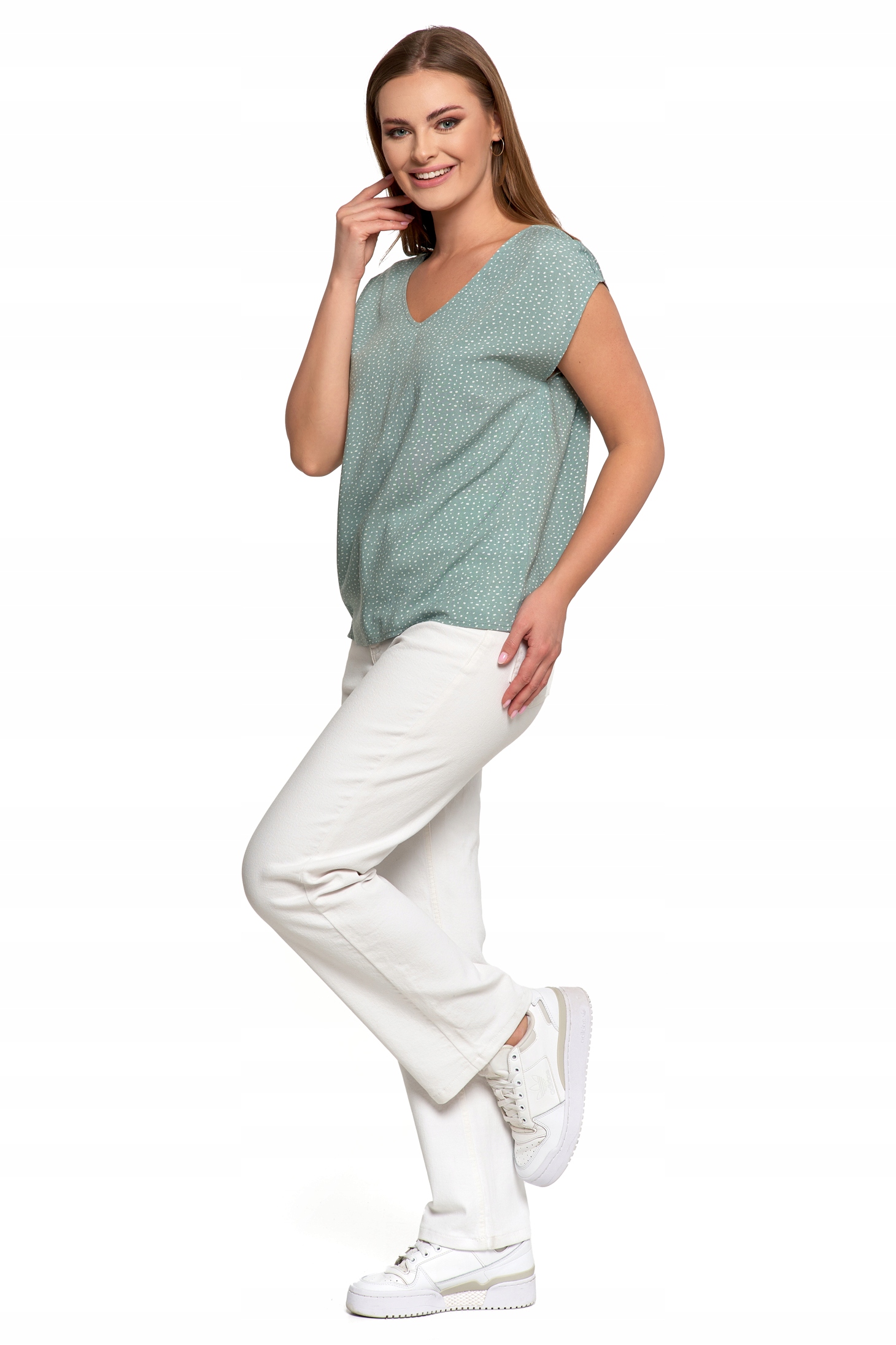 Хлопковая вискозовая женская блузка в зеленом - это стильное и воздушное предложение каждый день. Изготовленная из легкой, дышащей ткани, он обеспечивает комфорт и идеально подходит для фигуры. V -образный вырез тонко подчеркивает шею, а декоративная перекладина на спине добавляет блузку оригинального персонажа. Свободный порез гарантирует свободу передвижения и легкость, идеально подходящее как штаны, так и юбки. Деликатный зеленый оттенок с тонким рисунком придает ему свежесть и женственное очарование. Это отличный выбор для повседневной и случайной стилизации, которая будет работать в любое время года.