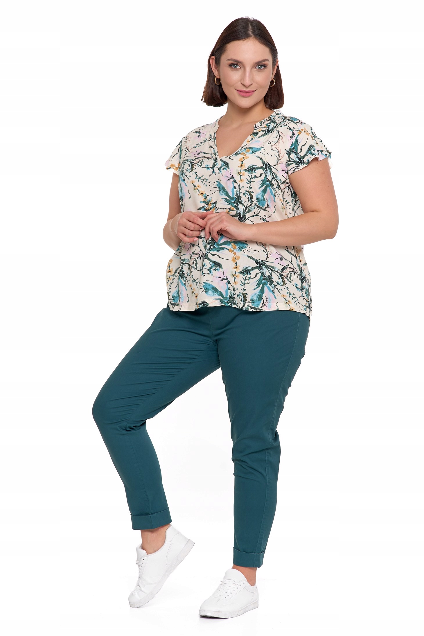 Эта легкая и воздушная женская вискозная блузка - идеальный выбор для женщин, которые ценят комфорт и женский стиль. Свободный разрез обеспечивает свободу движения и отлично работает как на ежедневной основе, так и в более элегантных случаях. V -neck тонко подчеркивает шею, а короткие рукава с изличими добавляют романтическое обаяние.