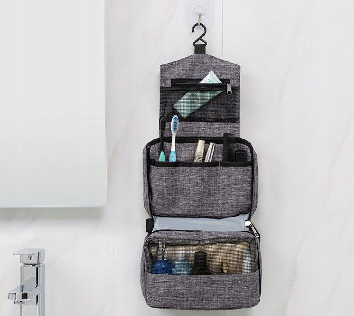 Сумка на крючке используется для хранения косметики и средств по уходу во время путешествия. Он изготовлен из очень прочного и водонепроницаемого материала Оксфорд. Имеет 3 кармана, а в разложенном виде все аксессуары находятся под рукой.