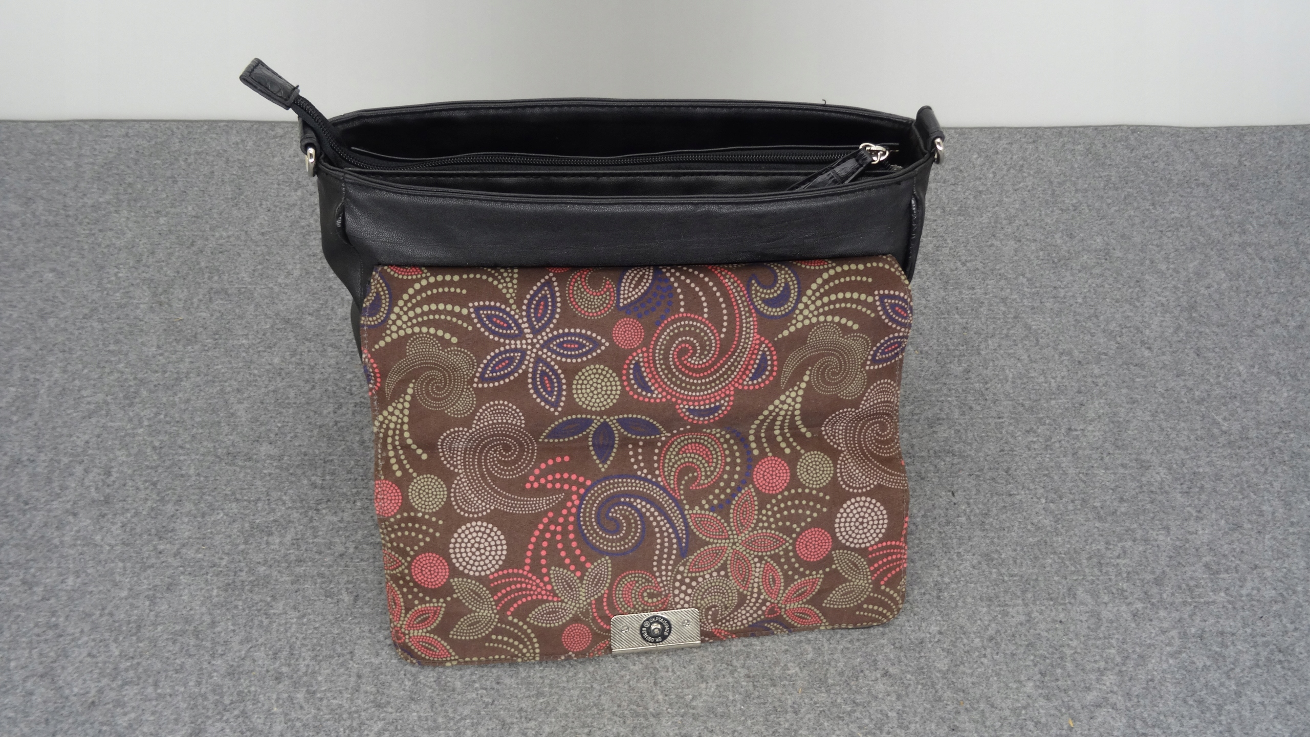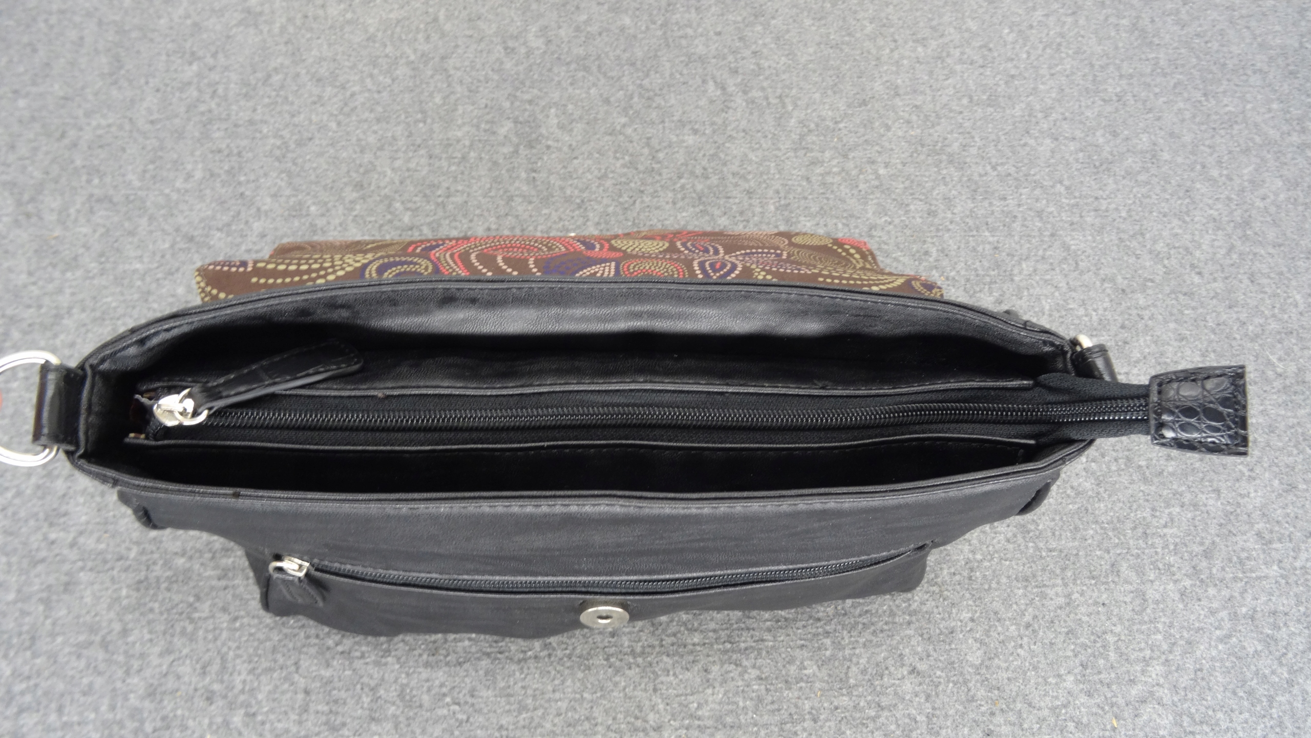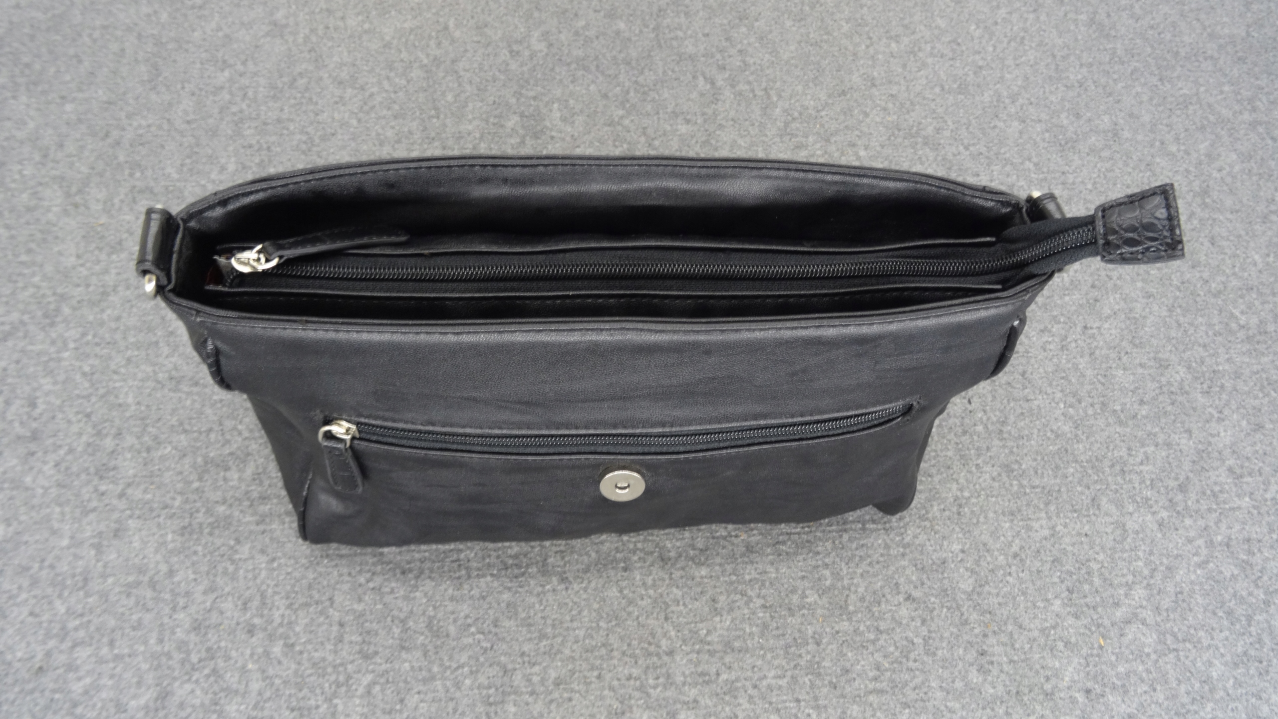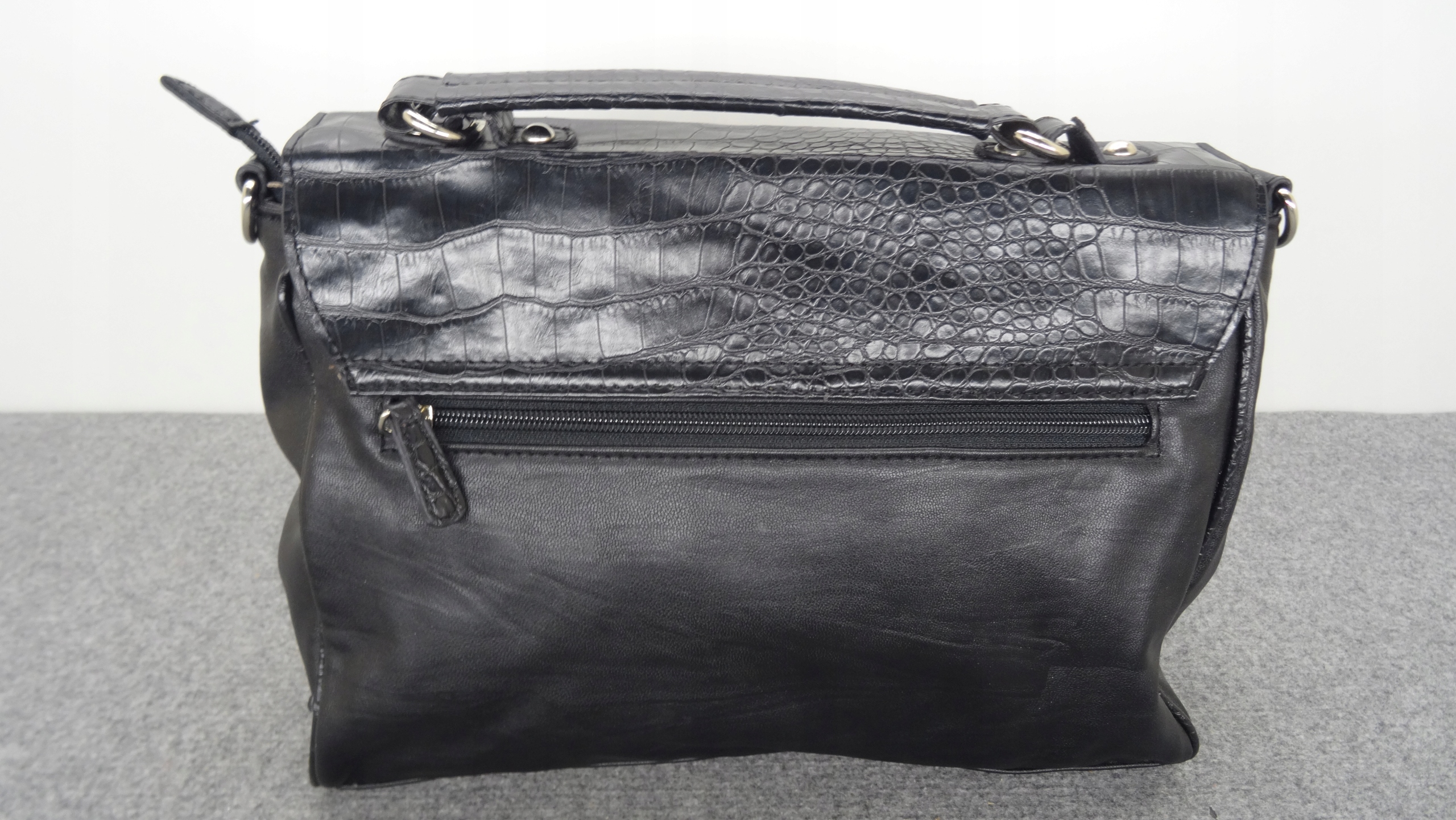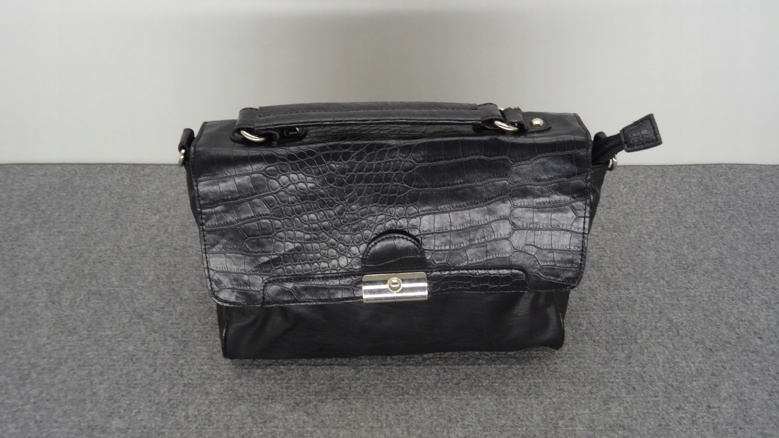 Черная женская сумочка с верхней ручкой. Сумка закрывается на магнитную застежку. Сумка закрывается на молнию. Внутри под клапаном с одной стороны небольшой карман на молнии, с другой стороны два небольших кармана. Снаружи под клапаном сумки имеется карман на молнии.