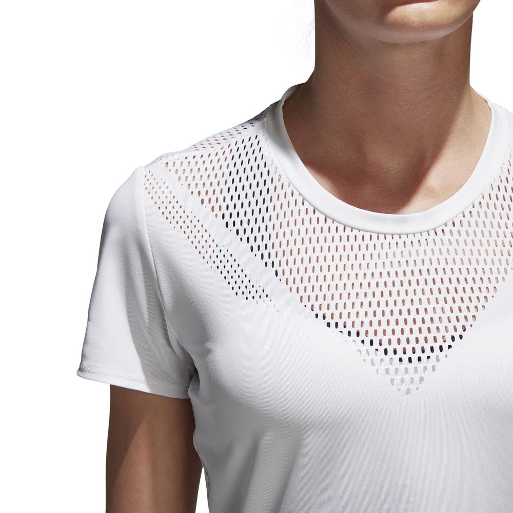 Эта приталенная модель отличается неглубоким вырезом и воздушными сетчатыми вставками спереди и сзади, что увеличивает вентиляцию и позволяет наслаждаться свежестью во время занятий. Футболка украшена характерной лентой с тремя полосками вдоль спины и логотипом adidas Badge of Sport, расположенным под вырезом сзади.