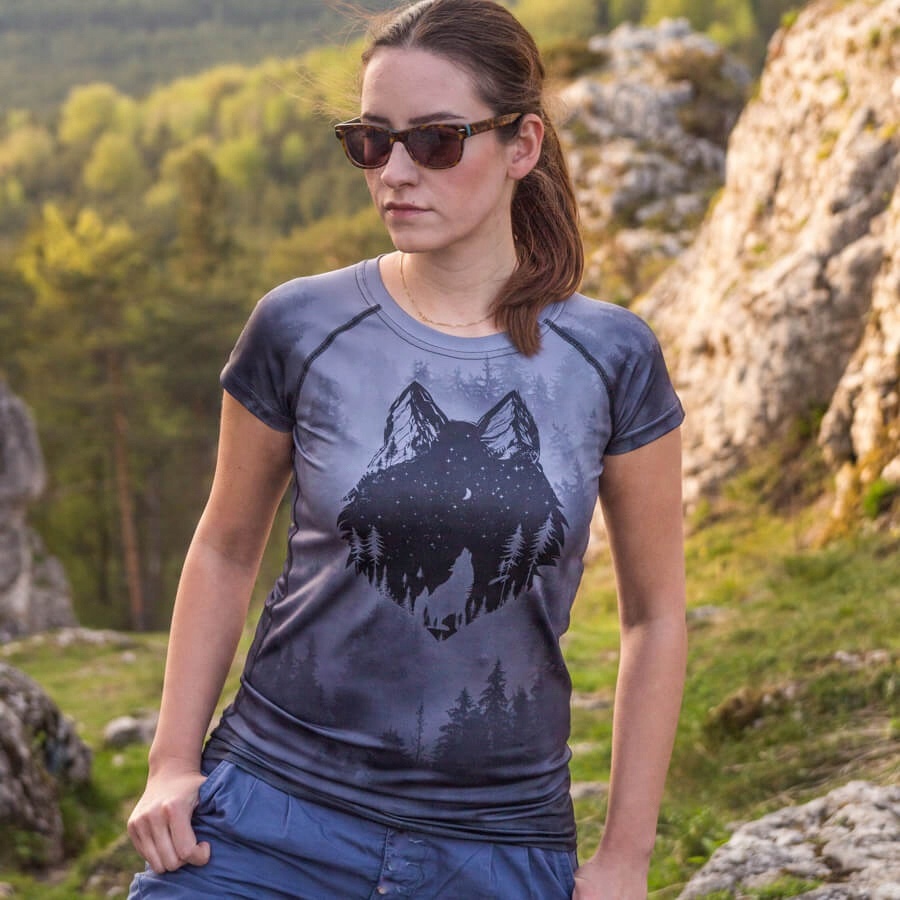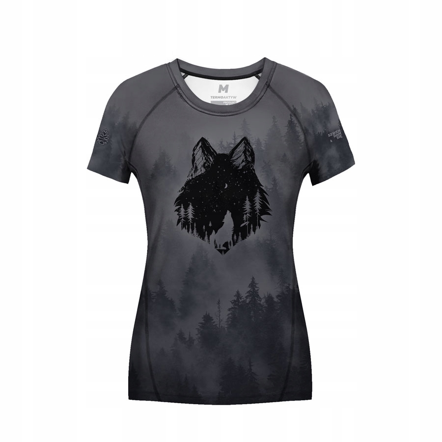 Компрессионная термофутболка с антибактериальными свойствами для активных женщин. Высокая плотность спортивной футболки Szwendam się обеспечивает отличную терморегуляцию, благодаря чему тело не остывает и поддерживает соответствующую температуру как во время тренировок, так и во время перерывов. Используемый материал отводит влагу с поверхности тела и быстро сохнет. Женская футболка с полноценным принтом, изображающим темный лес, окутанный туманом. В центральной части футболки контур головы волка с волком поменьше, воющим на луну. На спине мы разместили большую надпись «Странствующий». Любая женщина в такой футболке раскроет свои волчьи силы, превратившись в сильную и уверенную в себе альфа-самку. Ой!