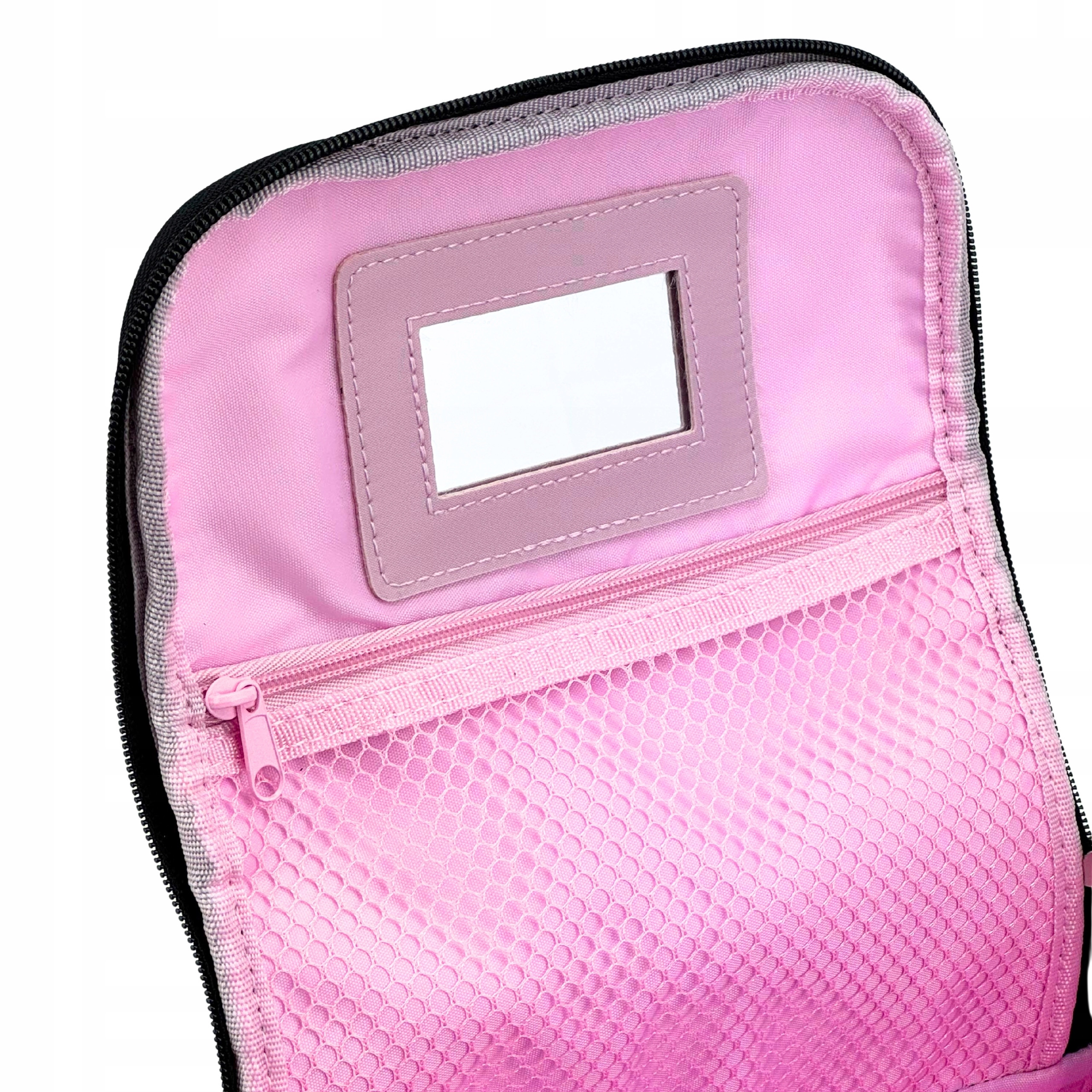 - Дополнительный сетчатый карман на молнии и два боковые карманы для косметики внутри косметички.