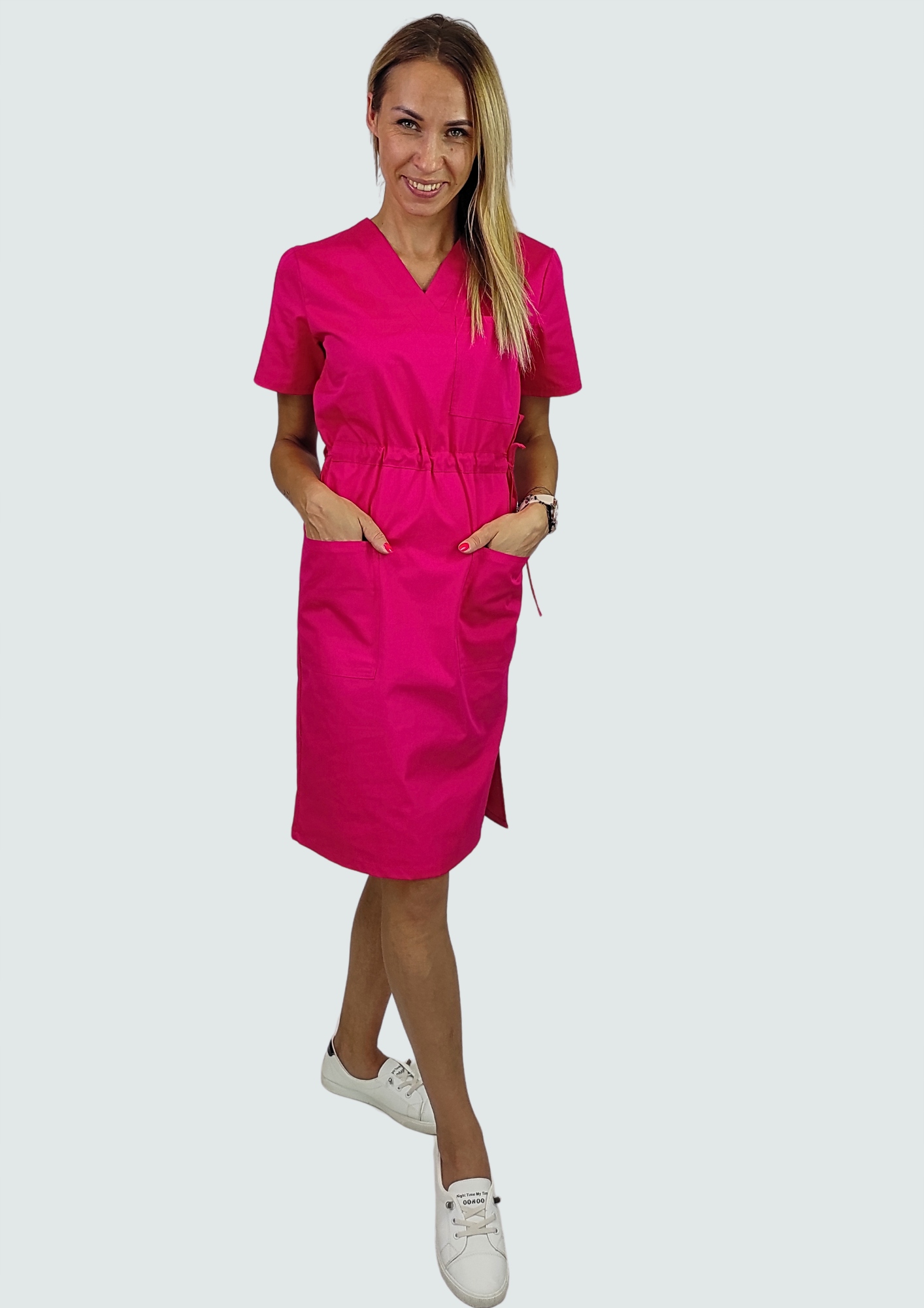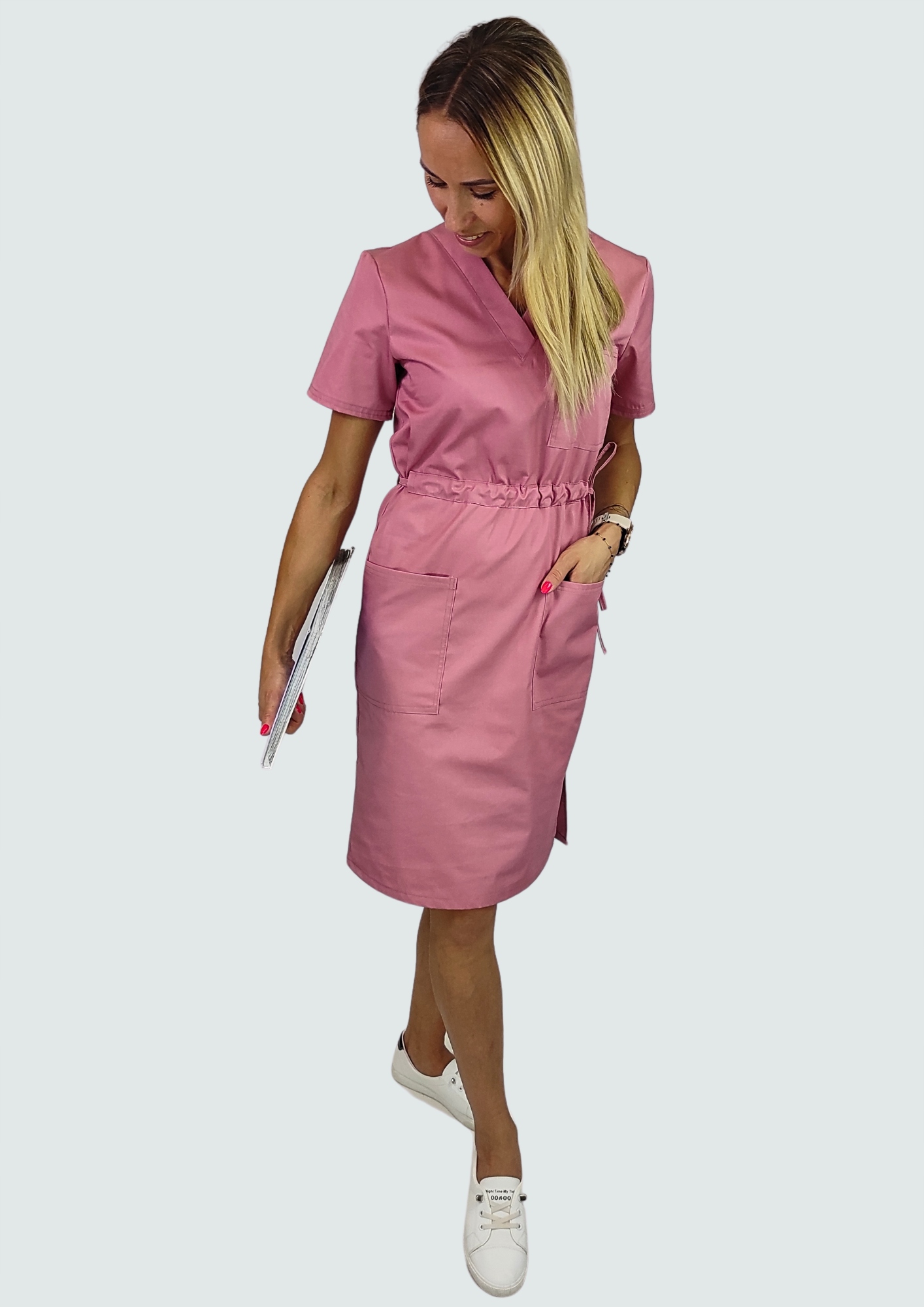 Медицинская одежда — товар, адресованный женскому персоналу. Очень элегантное и очень удобное платье. Он призван повысить комфорт работы – ткань приятна коже даже в течение многих часов. Благодаря вместительным карманам вы всегда сможете иметь под рукой необходимую посуду и аксессуары. Платье имеет 3 кармана. Скроенный покрой изделия с небольшой линией талии выглядит очень стильно – завязки обеспечивают лучшую посадку, благодаря чему платье можно лучше регулировать. V-образный вырез. Боковые разрезы внизу увеличивают свободу движений.