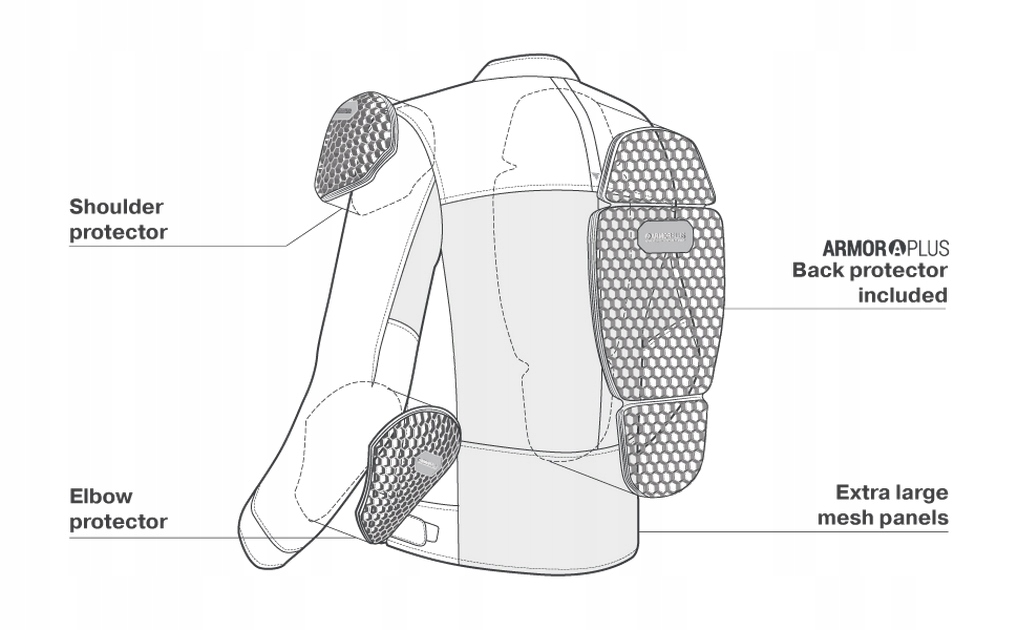 Легкая сетчатая ткань в сочетании с сертифицированными протекторами Hi-flow разработана для того, чтобы хорошо удерживать тело при ударах, обеспечивая при этом хорошую вентиляцию. Особая форма протекторов с двухслойной сотовой структурой обеспечивает эффективную защиту и максимальную воздухопроницаемость. Для повышения безопасности куртка оснащена защитой спины CE уровня 2, изготовленной по той же технологии и конструкции, что и локти и плечи.