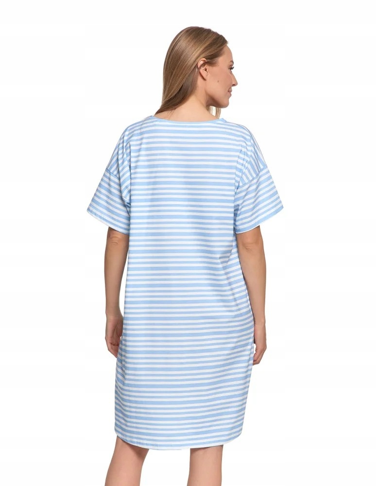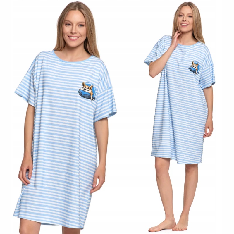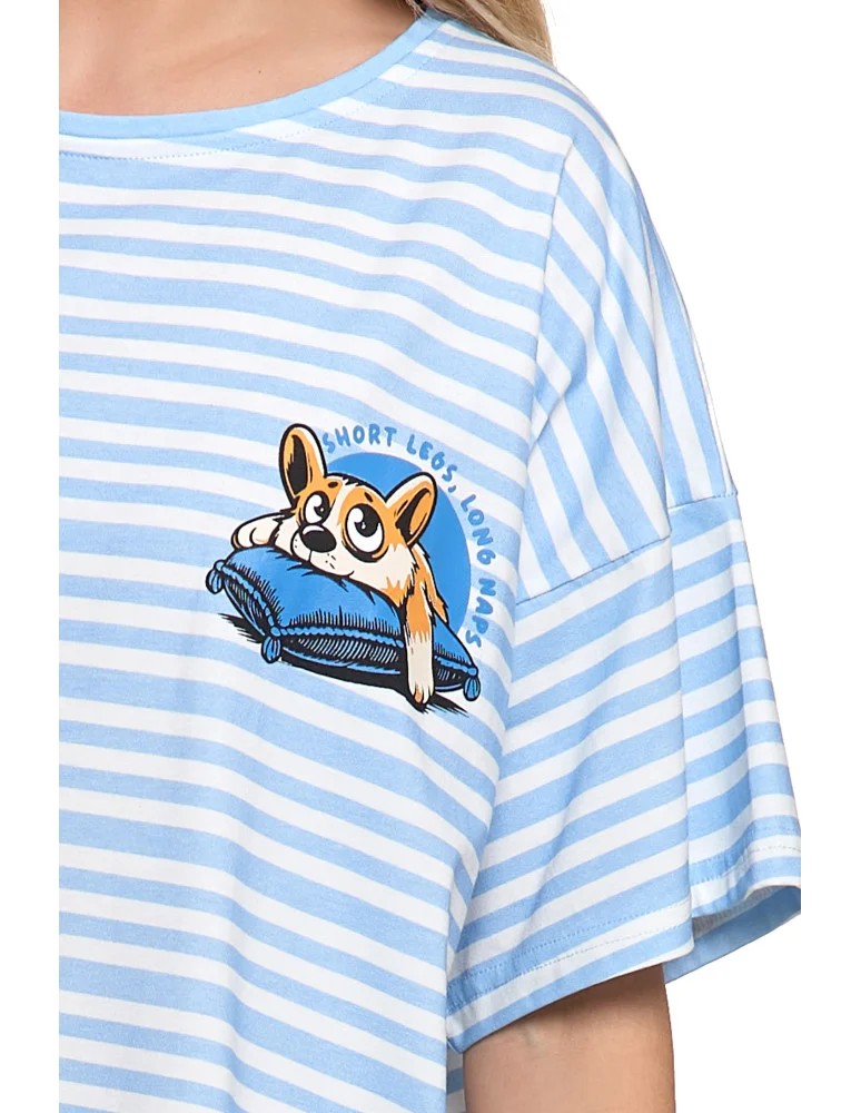 Повседневная ночная рубашка в пастельные, сине-белые полосы с очаровательным собачьим принтом на груди.