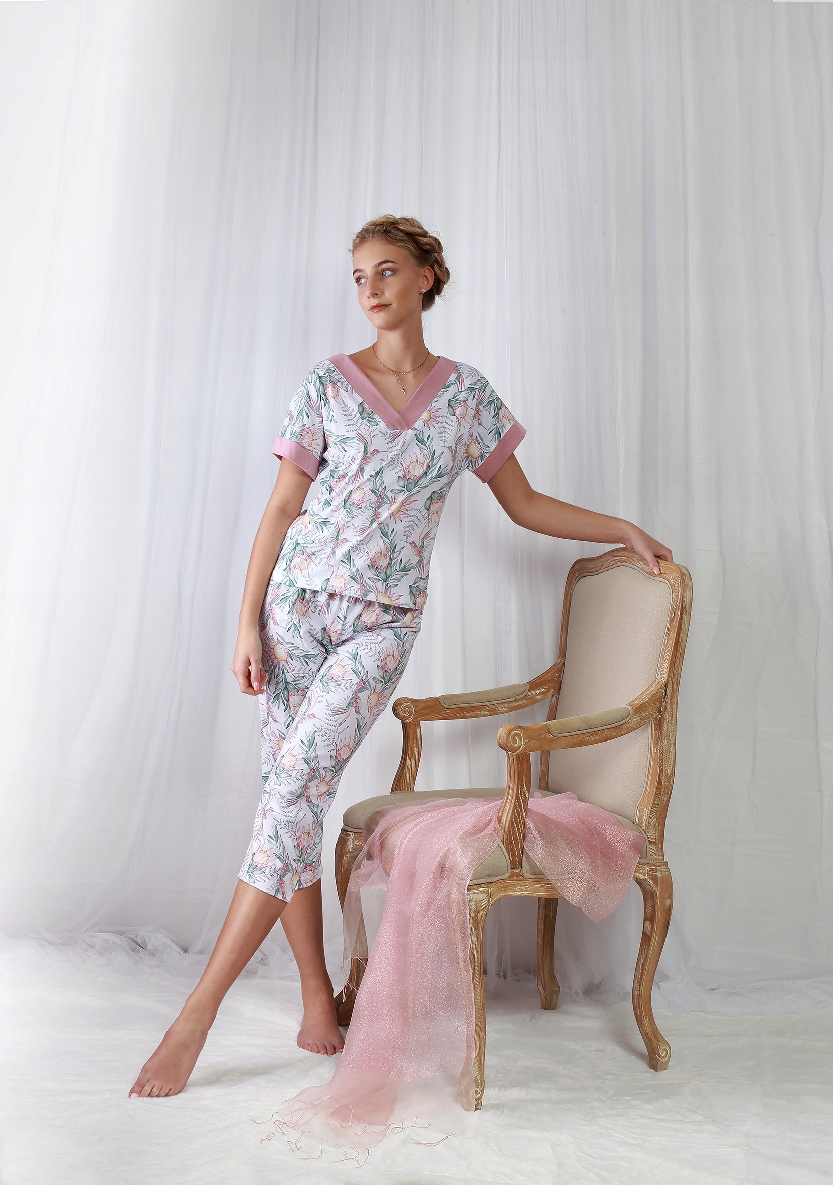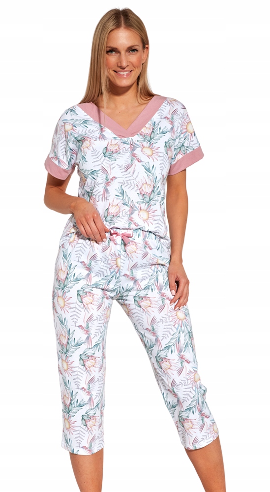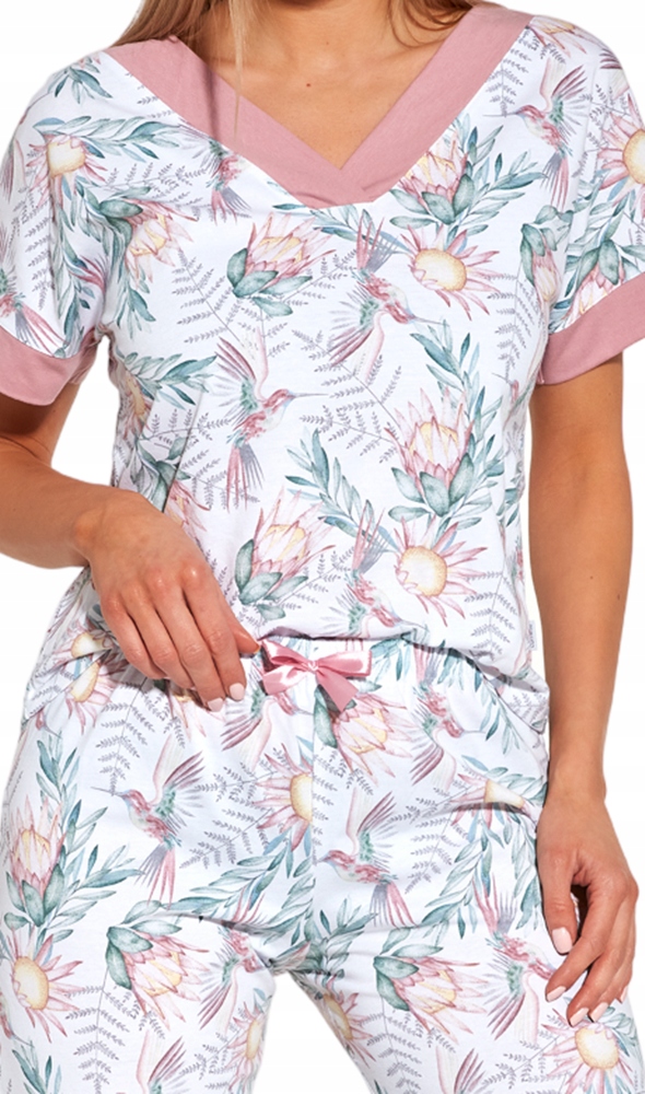 Комплект состоит из двух элементов - белой футболки с короткими рукавами с ярким цветочным узором, с изящным V-образным вырезом, горловина и рукава отделаны темно-розовой манжетой, и белых брюк 7/8 с растительный узор, оснащен резинкой, обеспечивающей максимальный комфорт при ношении. Женские хлопковые пижамы обеспечивают высокий комфорт во время отдыха и сна, а также красиво выглядят. Он женственный, тонкий и подходит женщинам всех возрастов! В наличии широкий размерный ряд – от M до 5XL.