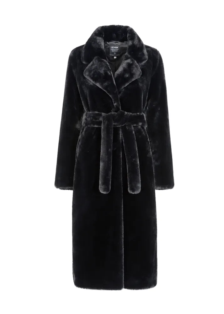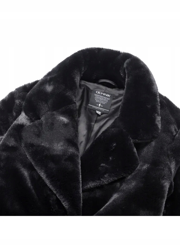 Женская длинная шуба черного цвета. Изготовлен из полиэфирной ткани – идеальный вариант для любителей экологического меха. Простая, напоминающая пальто форма без заметной талии и посадки, благодаря чему модель сидит мягко и, главное, не стесняет движений. Застежка на кнопки, задний воротник, поясной ремень, длинный прямой рукав, два прорезных кармана, боковые разрезы, длина миди