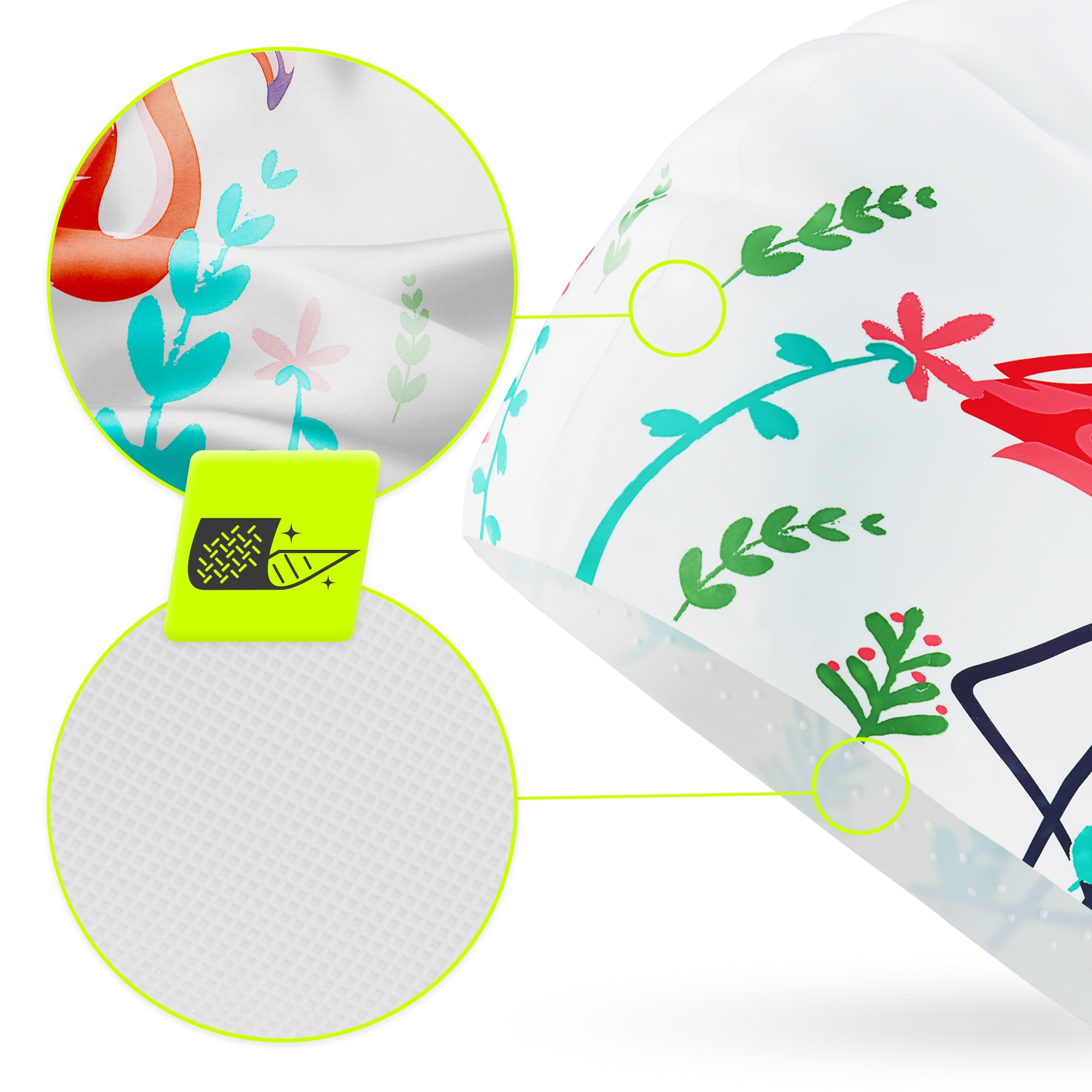 Дополнительное пространство для хвостика или коки позволяет свободно скрывать даже длинные и густые волосы, что увеличивает комфорт при плавании. Идеальная посадка, , несмотря на дополнительный материал для волос, заставляет силиконовую плавальную крышку оставаться в одном месте, не скручивается и не создает неприглядных складок. Более того, женский рисунок и красивые цвета доказывают, что комфорт может пойти рука об руку с отличным видом