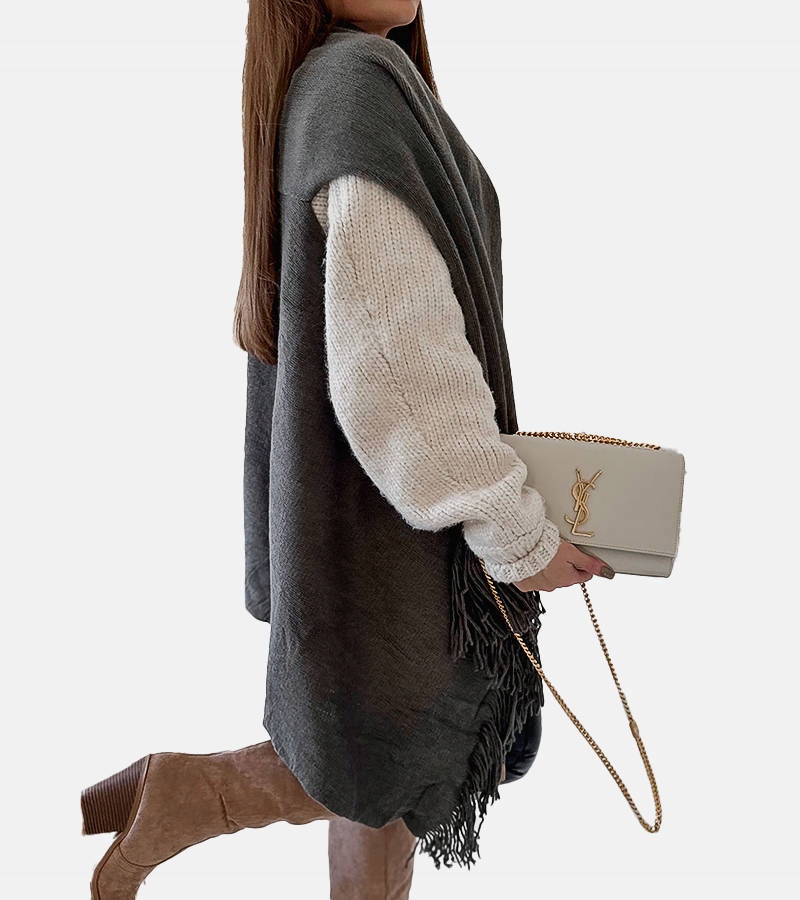 Июньское пончо из мягкого трикотажа. Пончо не имеет застежек. Накидка оснащена декоративной бахромой. Идеальный аксессуар для осени и зимы, когда хочется подчеркнуть свой повседневный образ модным и удобным элементом!
