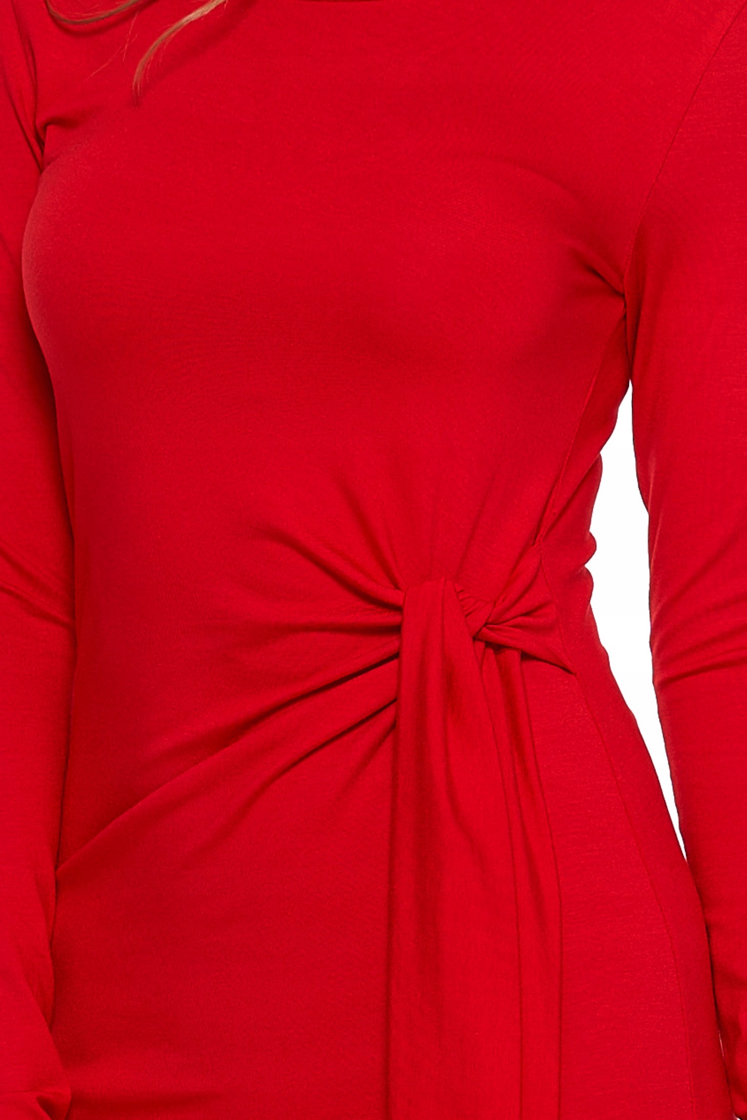 Платье имеет круглый вырез и установлен, что добавляет тонкий шарм. Талия имеет дополнительный ремешок, который может быть связан на носу или вокруг талии, который подчеркивает фигуру женского пола и добавляет уникальный характер платью. Платье имеет облегающий порез, который подчеркивает формы и обрезает по бокам, обеспечивая при этом комфорт и свободу движения.