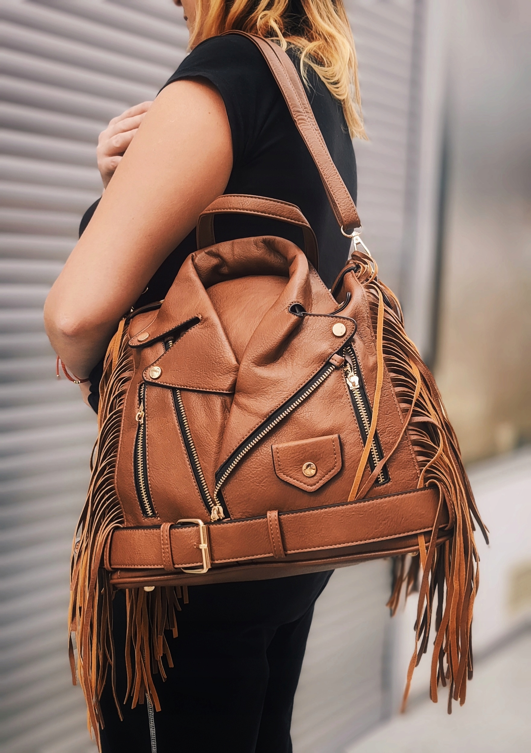 Вы ищете аксессуар, который подчеркнет ваш уникальный стиль? Откройте для себя нашу сумку-рюкзак в форме знаковой байкерской куртки! Это не только практичный аксессуар, но и смелый предмет гардероба, который обязательно привлечет внимание. Идеально подходит для любительниц бохо и стиля вестерн, идеально сочетается с ковбойскими сапогами, платьями с рюшами или джинсовыми нарядами.