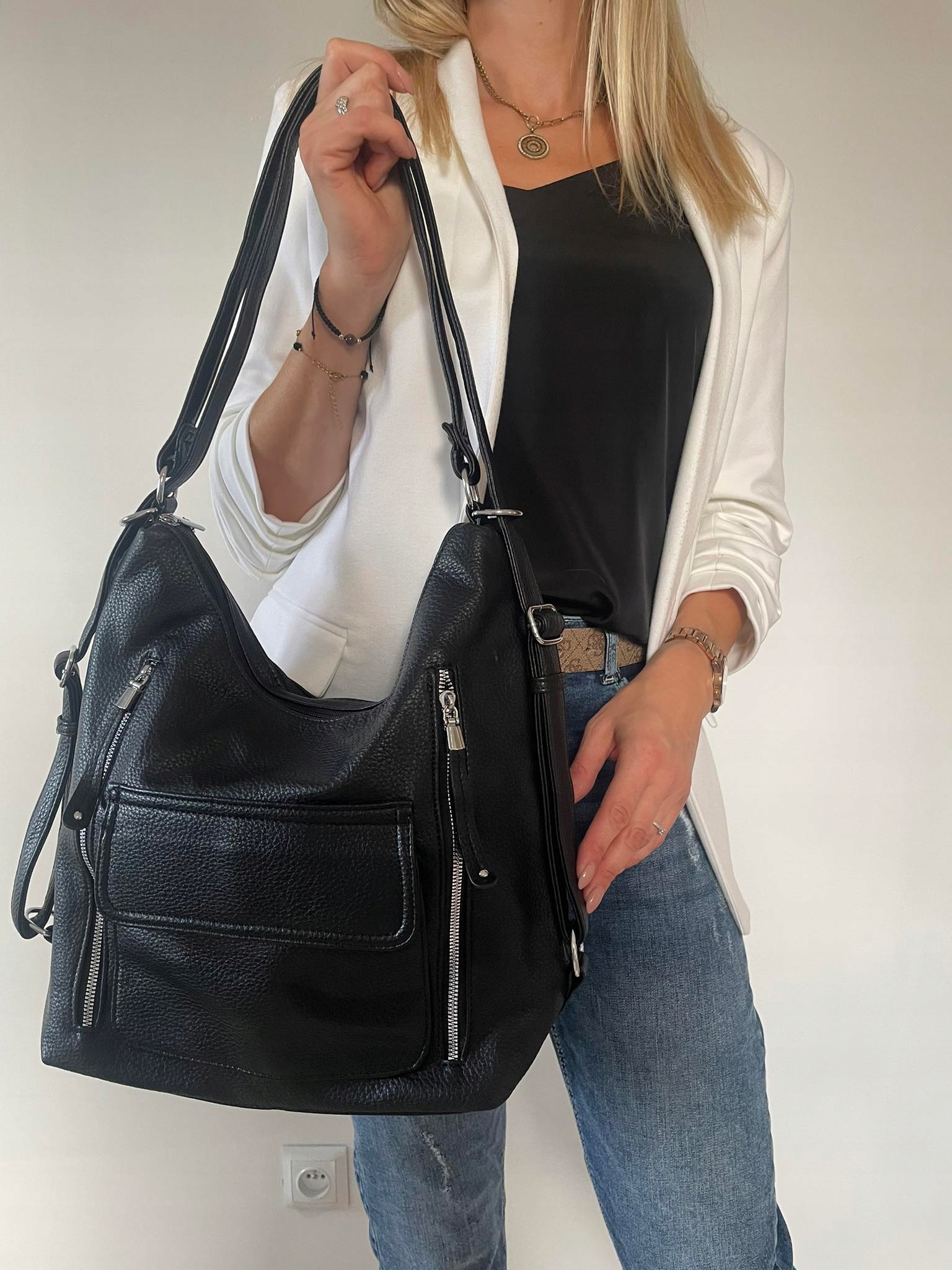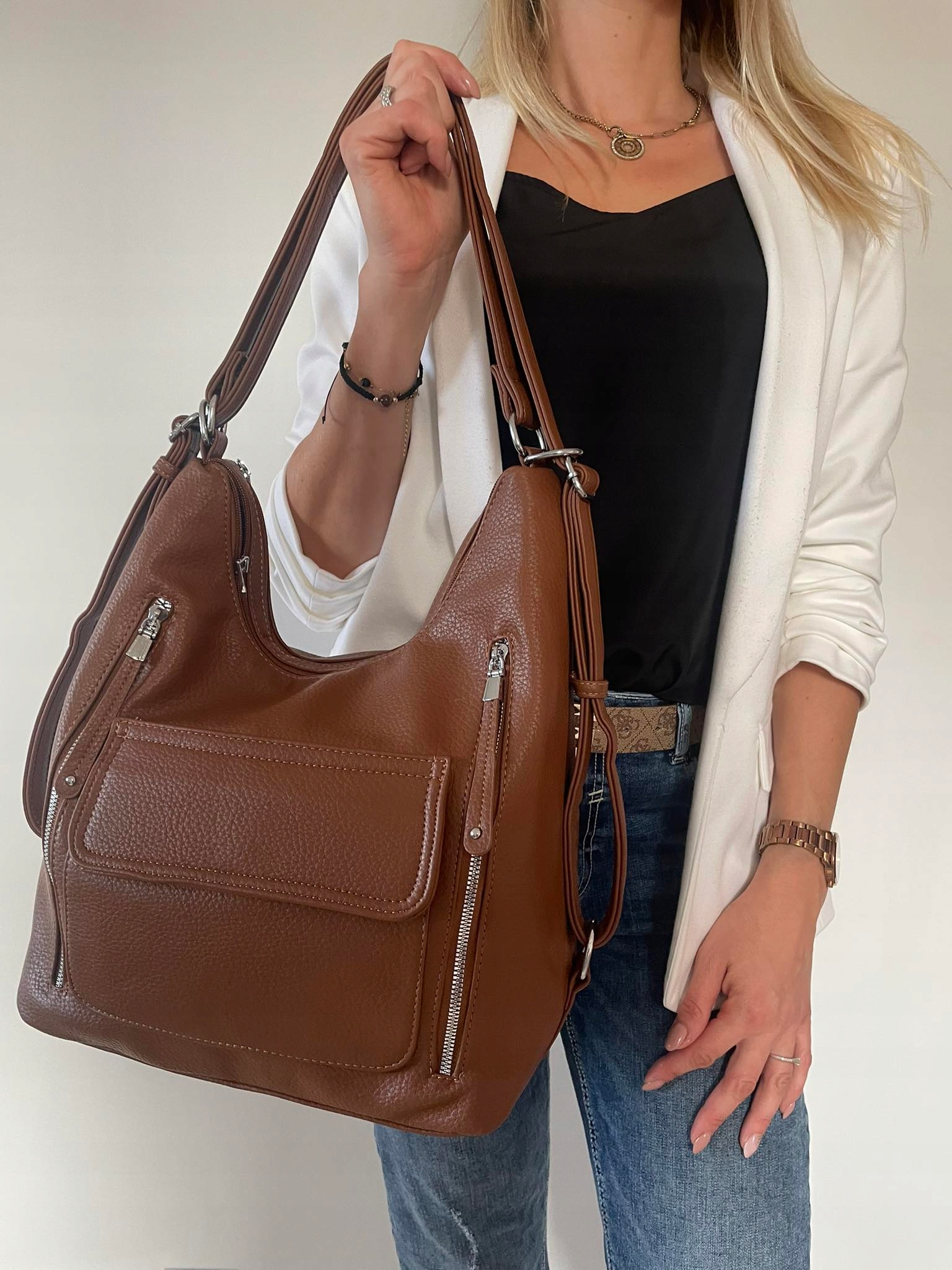 Женская сумка-мешок, которую можно носить как рюкзак.