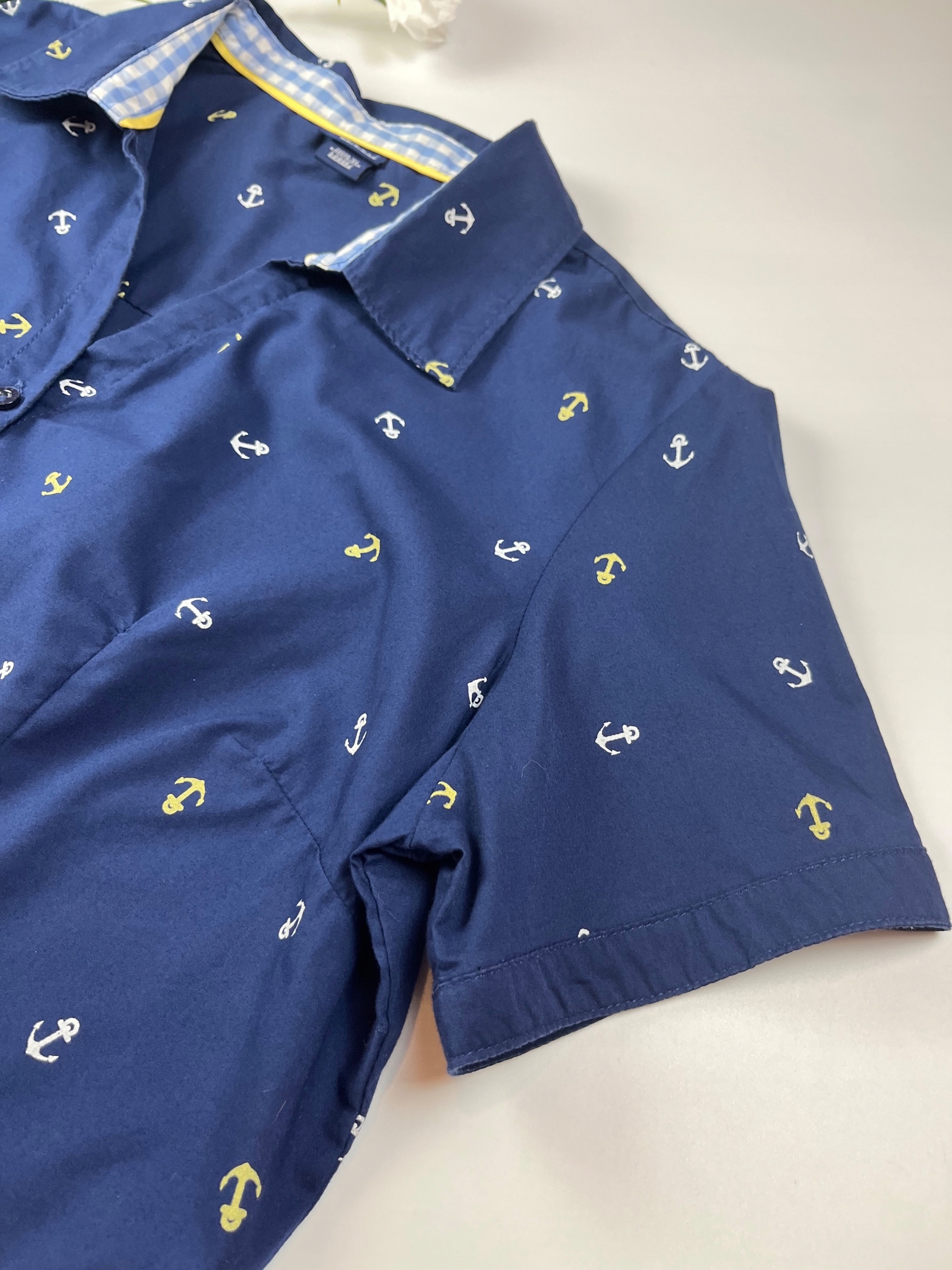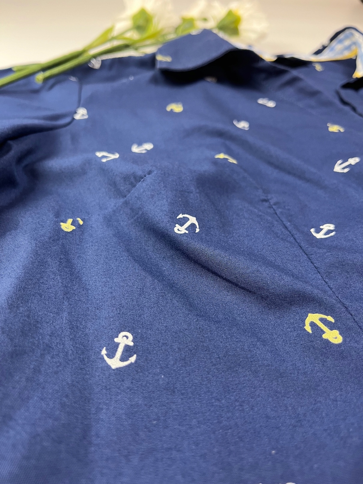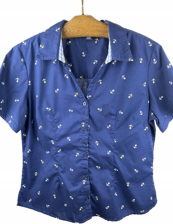 - Темно-синяя женская рубашка с якорями. Покрой блузы классический, приталенный, с воротником и короткими рукавами. Блузка прекрасно дополнит многие стили, как с джинсами, так и с брюками со складками или юбкой.