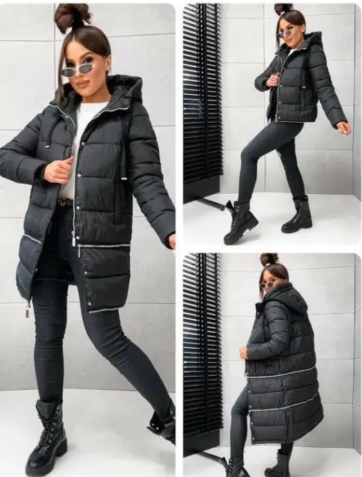 Куртка имеет 3 молнии, поэтому ее можно носить 3 разными способами. Выбирайте длину мини, миди или макси.