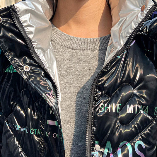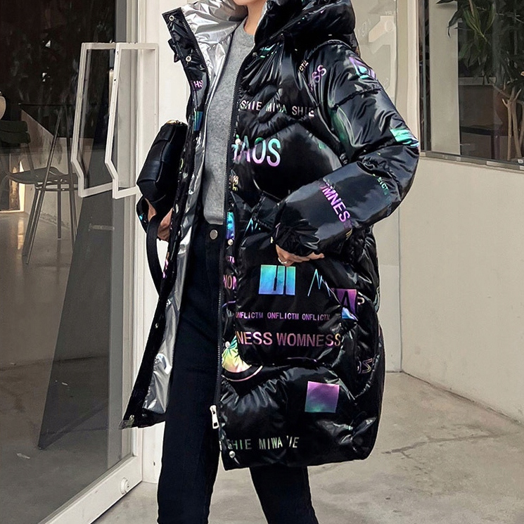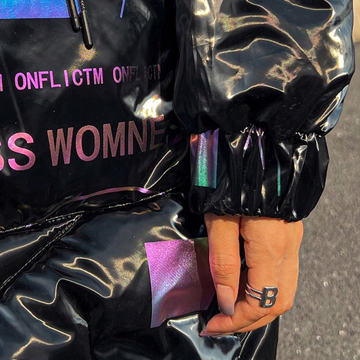 Уникальные принты различных цветов и форм, такие как буквы и другие узоры, придают куртке неповторимый характер.
