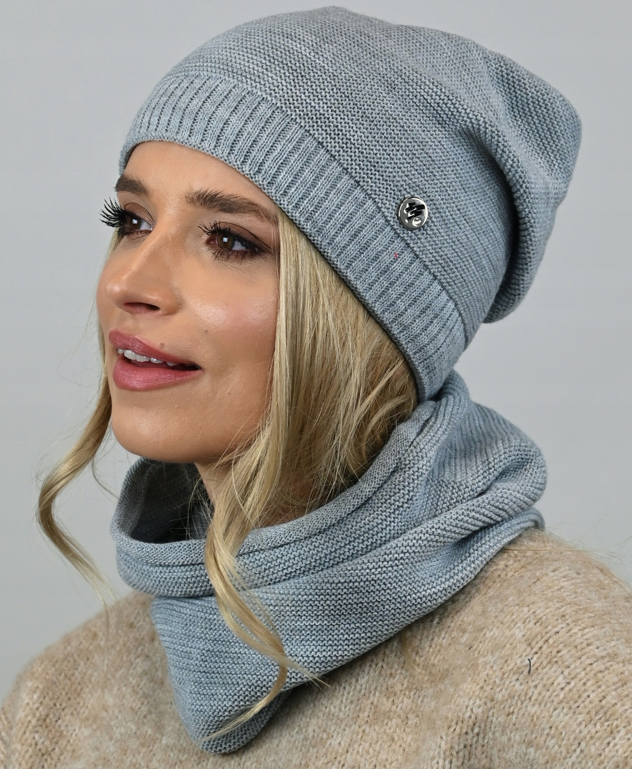 Шапка универсального размера, адаптирующаяся к голове. Комплект является незаменимым предметом одежды в осенне-зимнюю погоду, его универсальность позволяет носить его разными способами. Шапка слегка мягкая, хорошо сидит и ее можно носить по-разному.