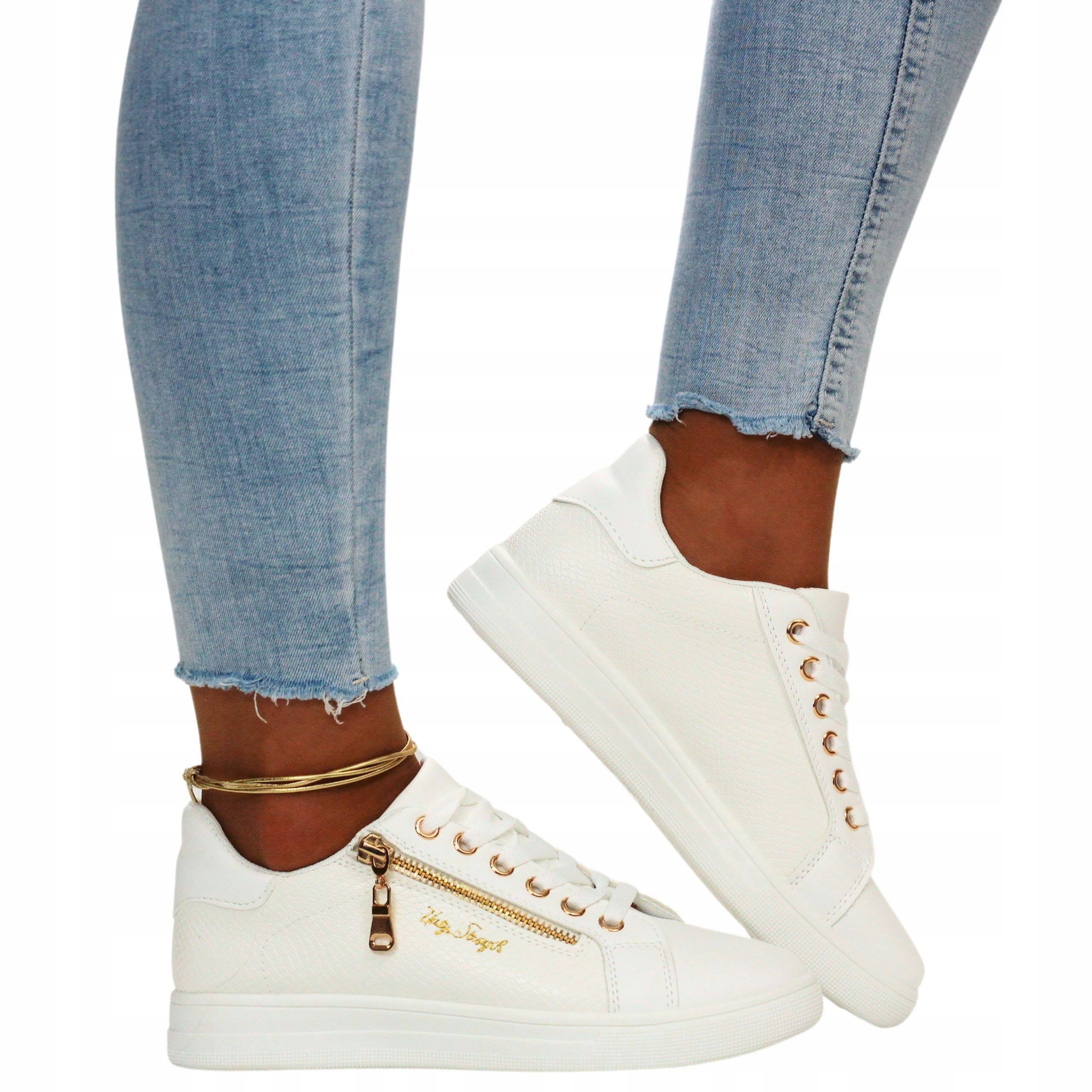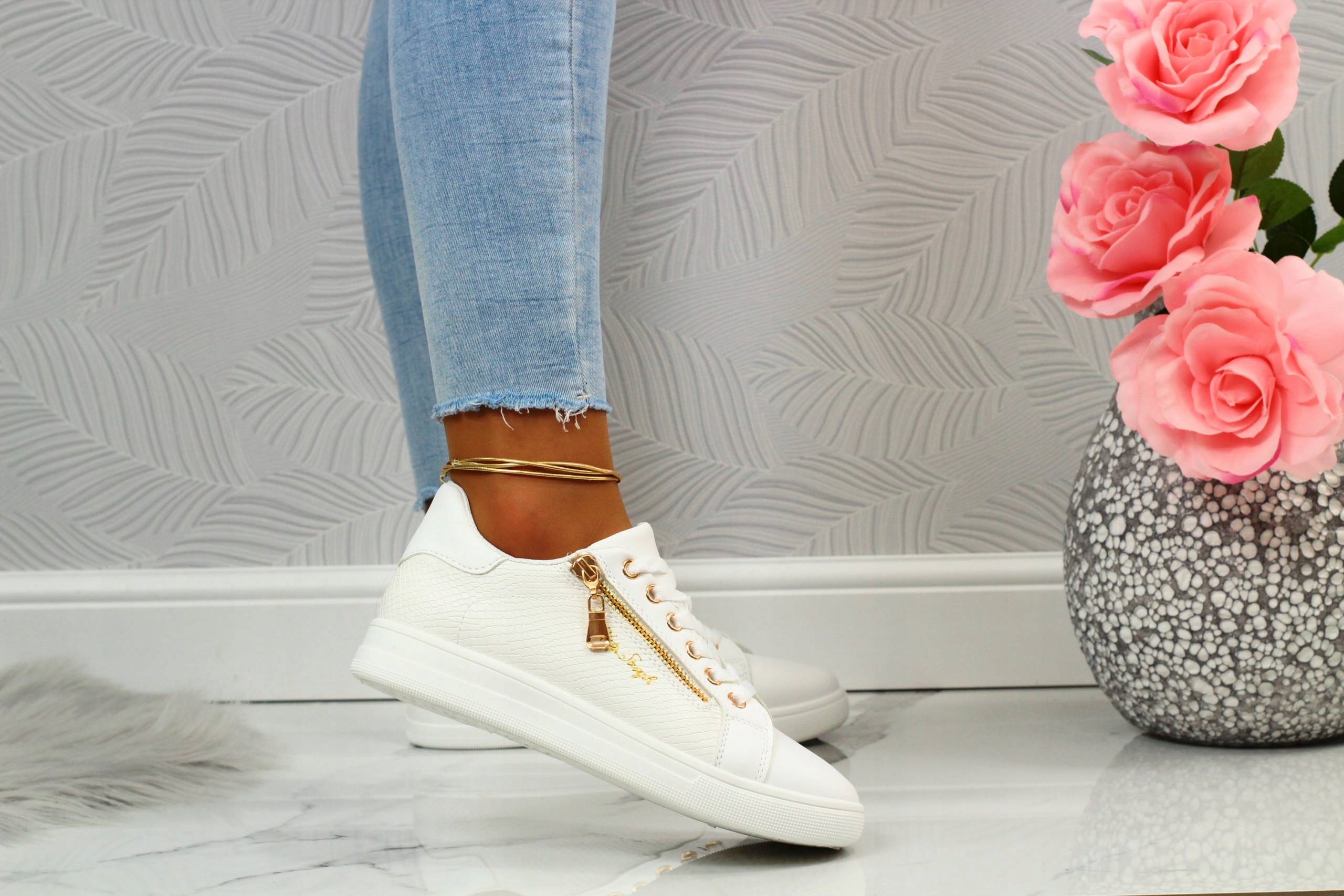 Женская спортивная обувь белого цвета с золотыми элементами и декоративной молнией. Изготовлен из материалов хорошего качества. Они подойдут как повседневная, так и спортивная обувь. Они легкие и обеспечивают удобство и комфорт использования. Устойчивая подошва, хорошо амортизирует ногу.