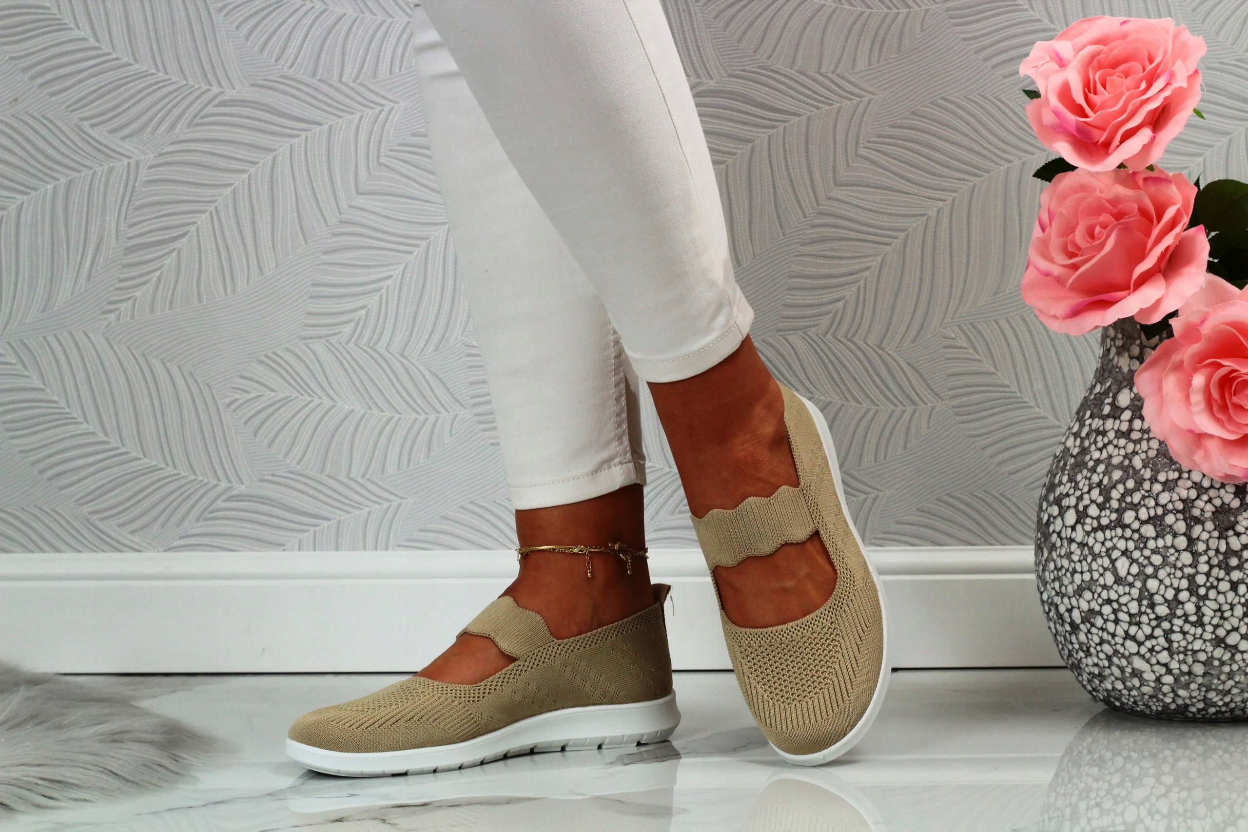 Женские бежевые спортивные туфли без шнуровки. Они идеальны в качестве повседневной обуви. Кроме того, они легкие, мягкие и обеспечивают удобство и комфорт использования. Простой дизайн подходит ко многим стилям.