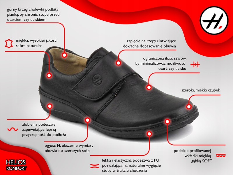 Женская обувь известного польского бренда Helios изготовлена из высококачественной натуральной лицевой кожи. Мягкая кожаная подкладка обеспечивает высокий комфорт ногам. Профилированная стелька покрыта мягкой губкой SOFT. Застежка-липучка позволяет быстро и удобно надевать обувь. Подошва из полиуретана легкая и гибкая, что позволяет ноге естественным образом сгибаться во время ходьбы. Модель выполнена шириной H - она шире.
