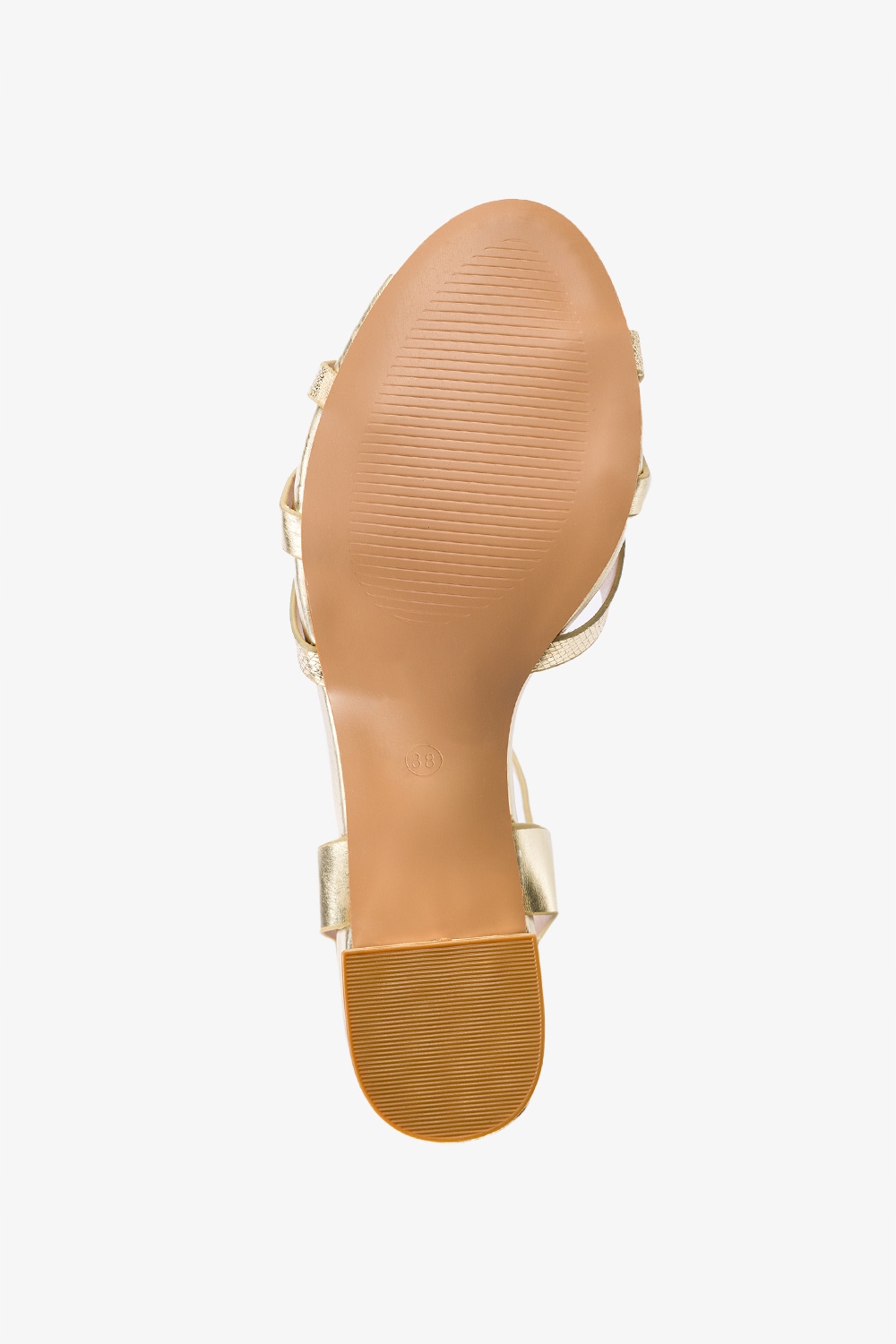 ЗОЛОТЫЕ САНДАЛИИ НА ДЕКОРАТИВНОМ КАБЛУКЕ, ЖЕНСКАЯ КОЖАНАЯ СТЕЛКА