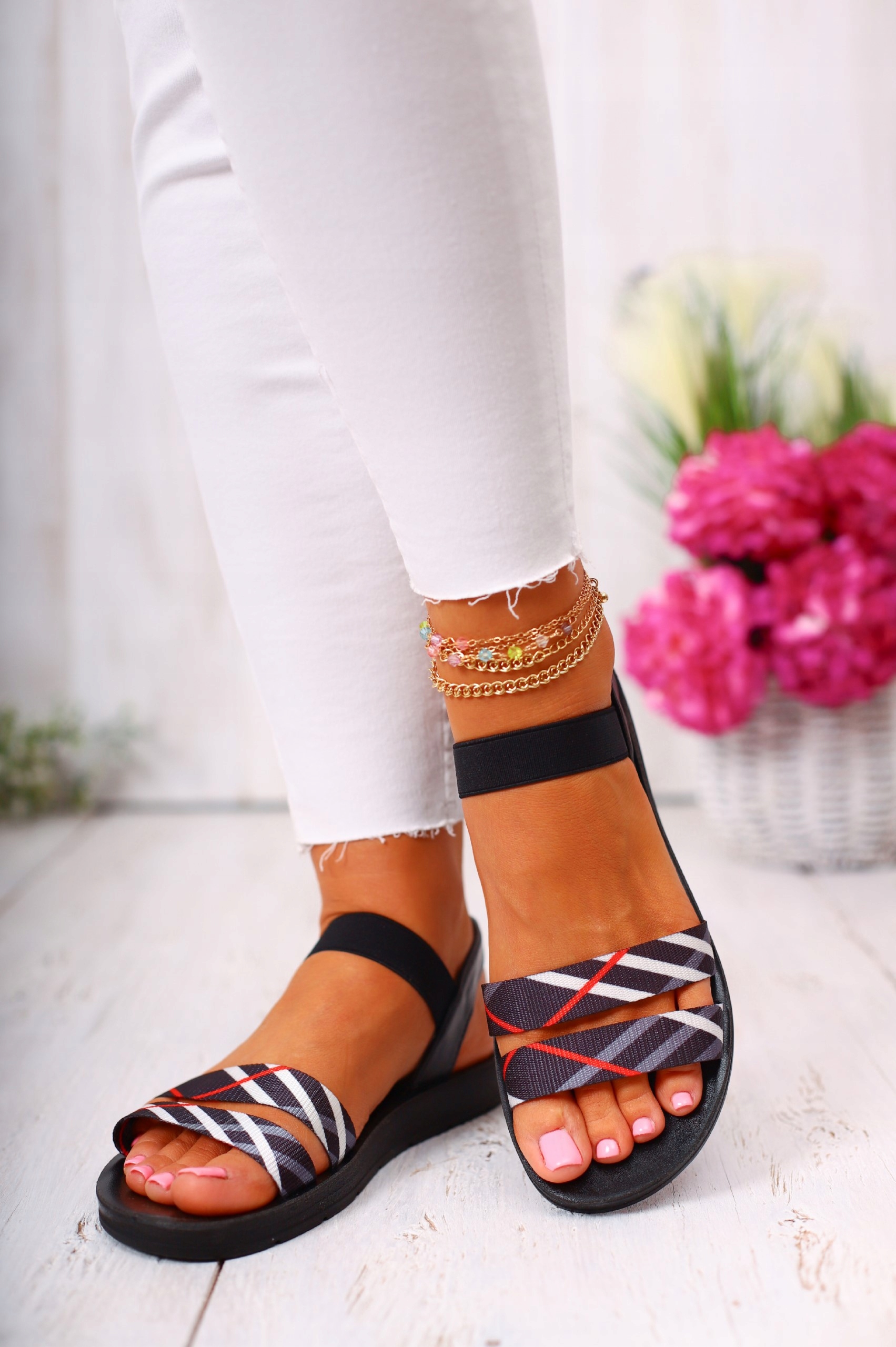 Черные сандалии женщин с полосками на плоской подошве. Simple Cut делает их идеальными в качестве повседневной обуви в летней жаре и легко адаптироваться к более официальной стилизации. У них есть эластичный резиновый ремешок на пятке для легкого нанесения и сопоставления с различным растяжением ног.