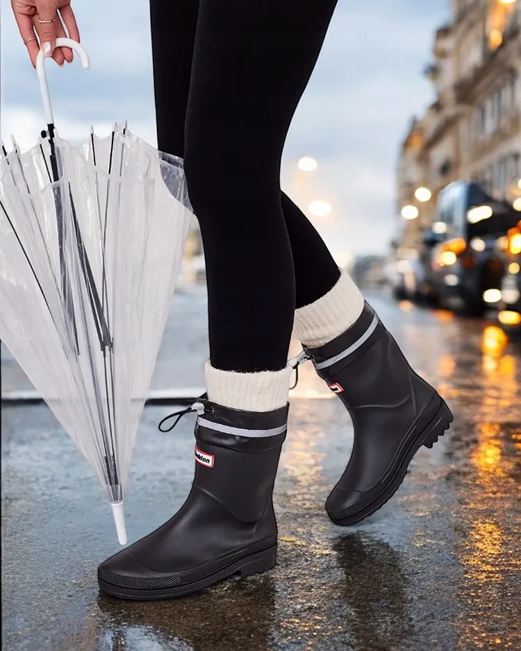 Классические женские плоские ботинки, изготовленные из резинового материала. В середине ткани вставка. Идеально подходит для осенних дождливых дней!