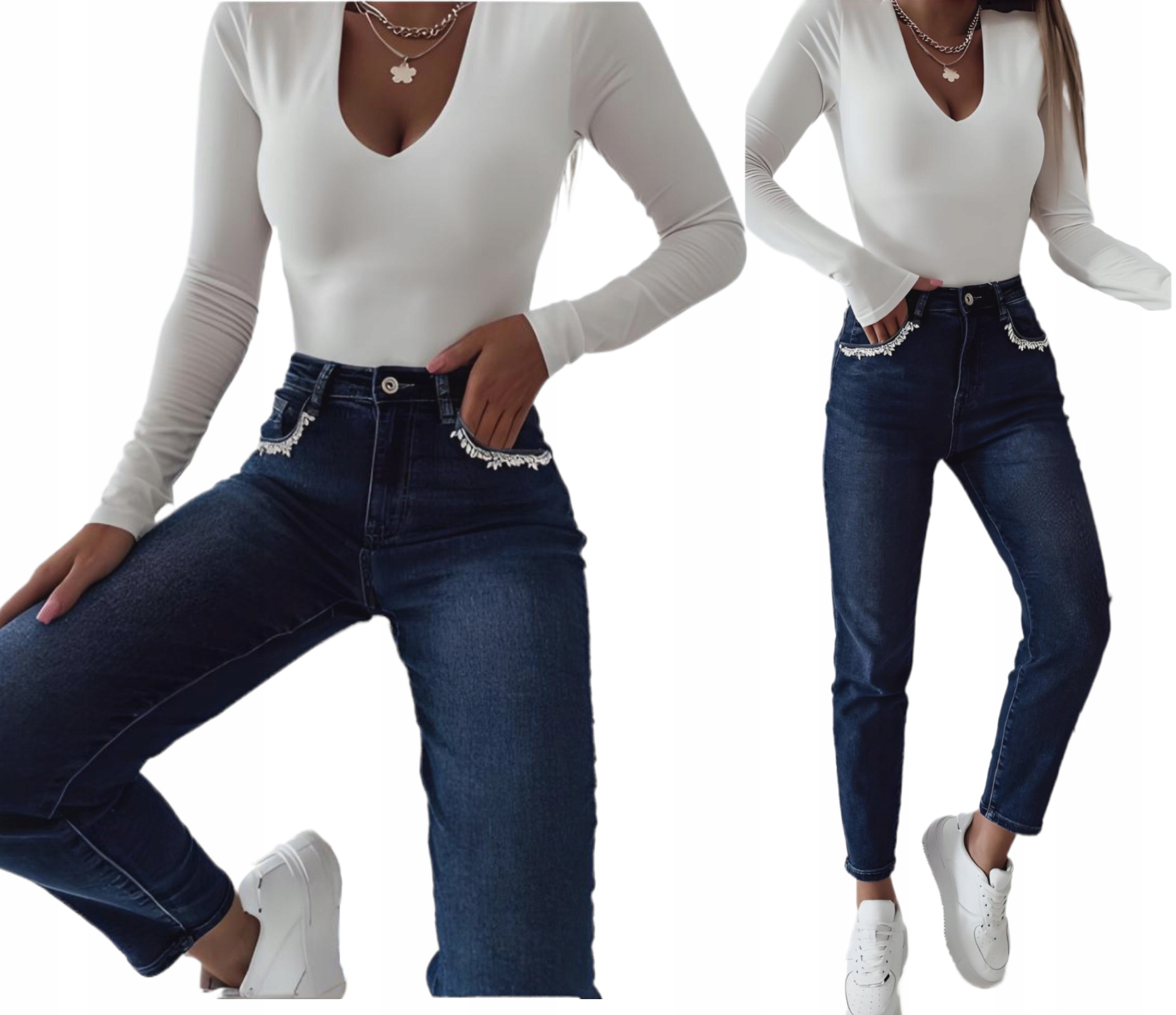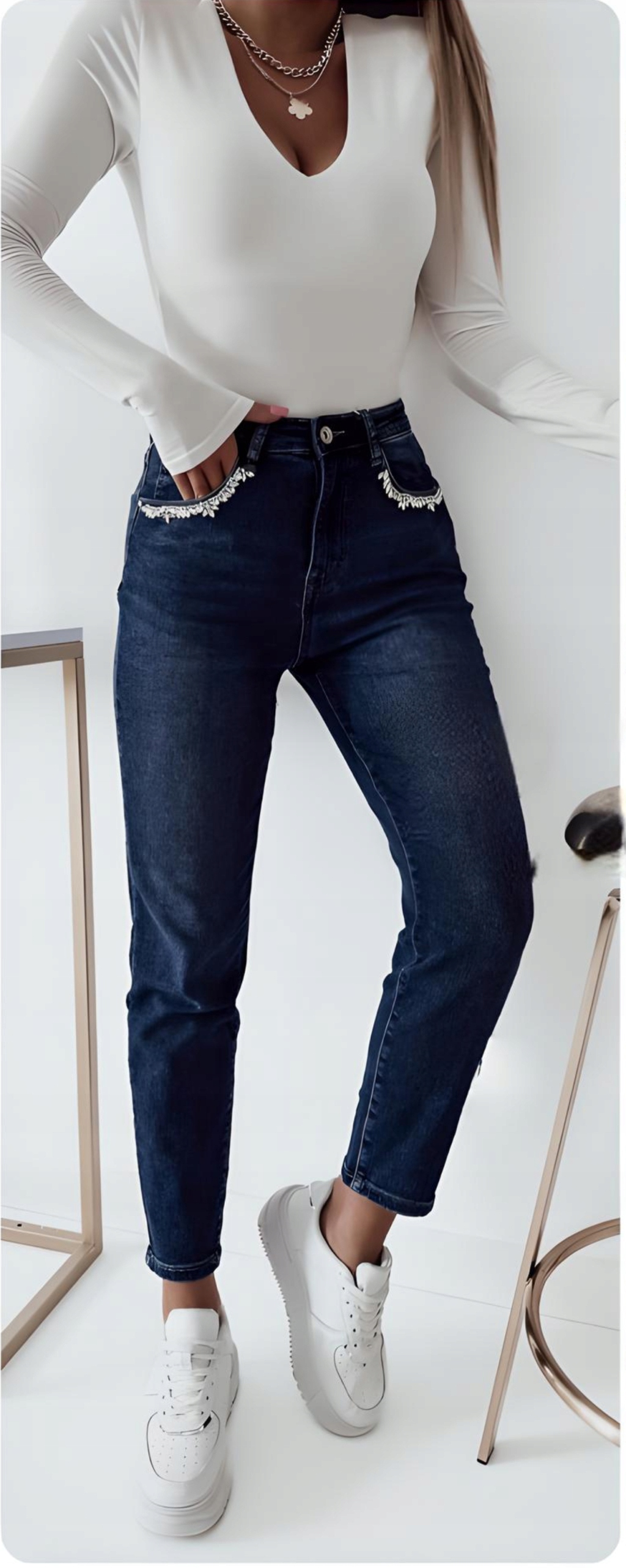 Симпатичные женские моделирующие джинсовые брюки с завышенной талией. Идеально подходит как для спортивного стиля, так и в сочетании с обувью на высоком каблуке. Очень модный крой джинс «мом». Выполненные из эластичного материала, они очень красиво облегают тело и подчеркивают женскую фигуру. Красивые декоративные стразы по периметру кармана.