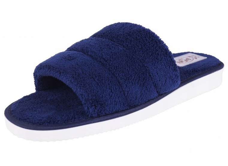 Темно-синие тапочки. Пальцы ног обнажены. Подошва из легкой пены. Воздушный материал, из которого они изготовлены, идеален для повседневного использования. Модный дизайн.