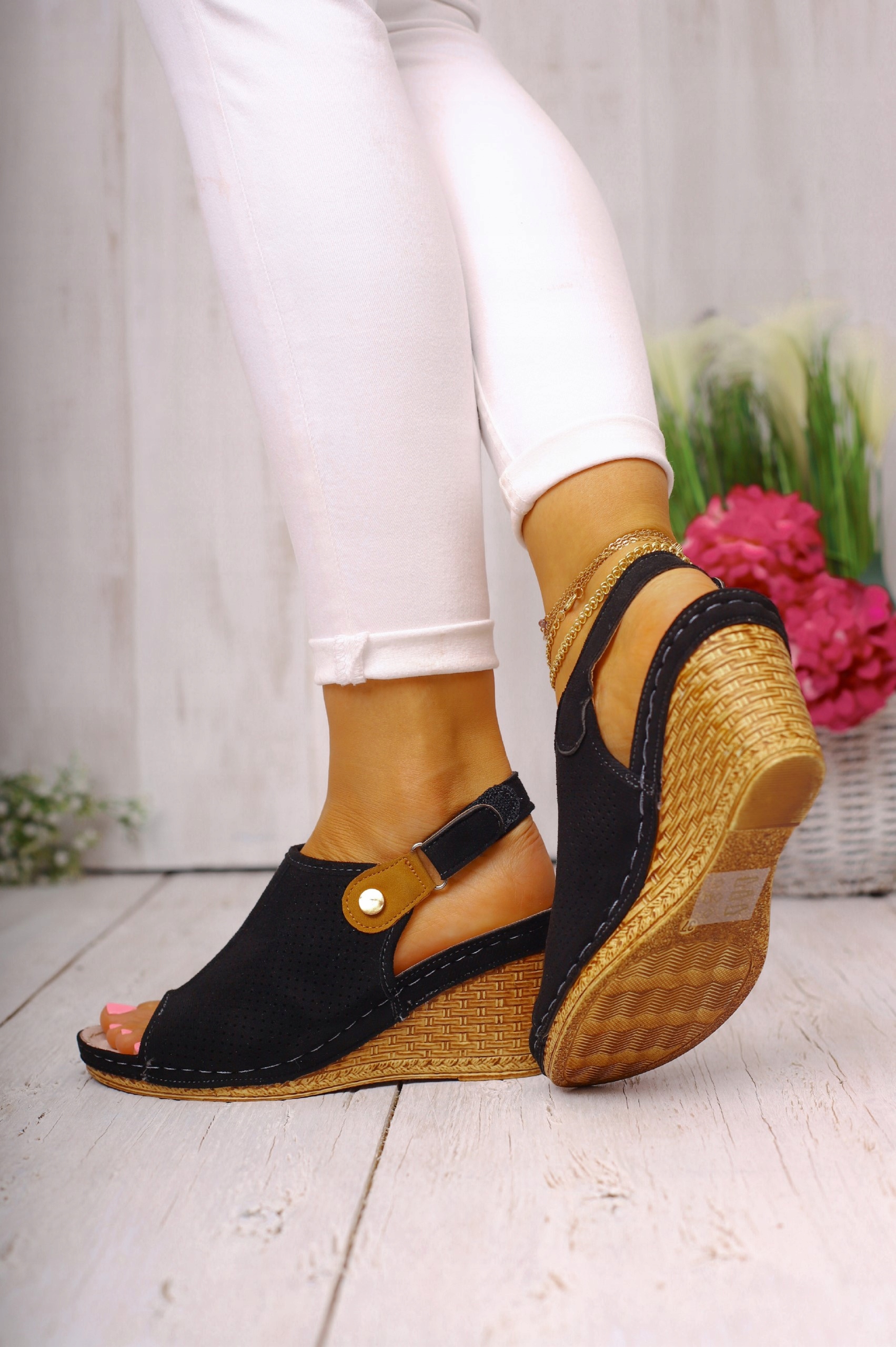 Женские босоножки на танкетке черного цвета. Удобная профилированная стелька делает их идеальными для повседневного использования. Простой крой в сочетании с любой укладкой придаст элегантности. Идеально подходят для прогулок и прогулок, они мягкие, ценятся многими и добавляют стиля. Застежка-пряжка облегчает регулировку обуви по ноге.