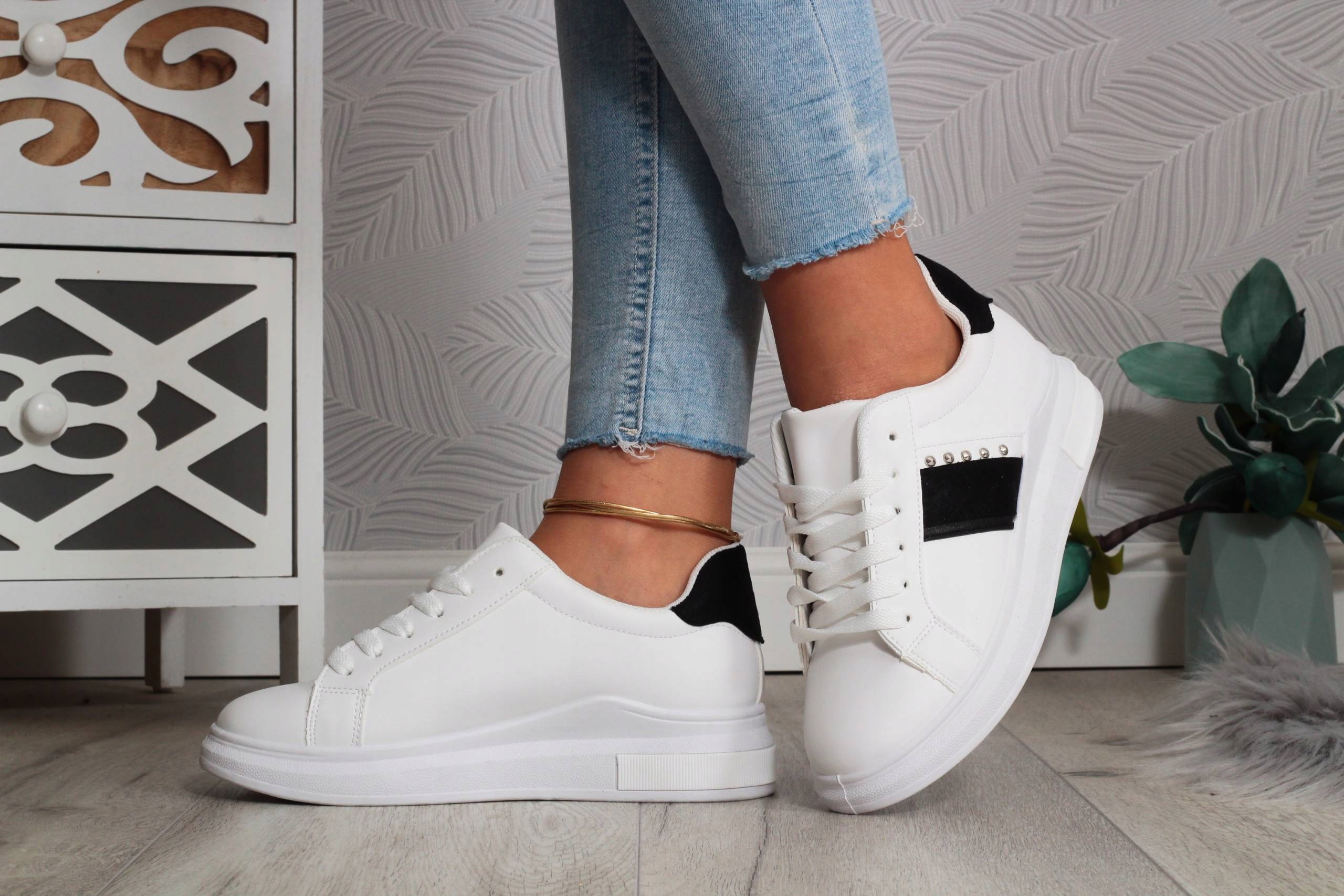 Женские спортивные туфли белого цвета с черными элементами на плоской подошве. ❤ Изготовлен из качественных материалов. Они подойдут как повседневная, так и спортивная обувь.💗 Кроссовки легкие, обеспечивают удобство и комфорт использования. Подошва устойчива и хорошо амортизирует ногу.Модный, неподвластный времени дизайн идеально подойдет ко многим стилям! На ноге смотрится хорошо. 💯