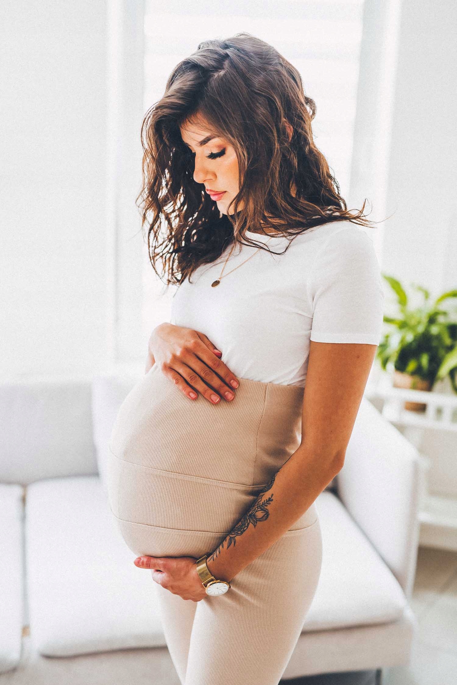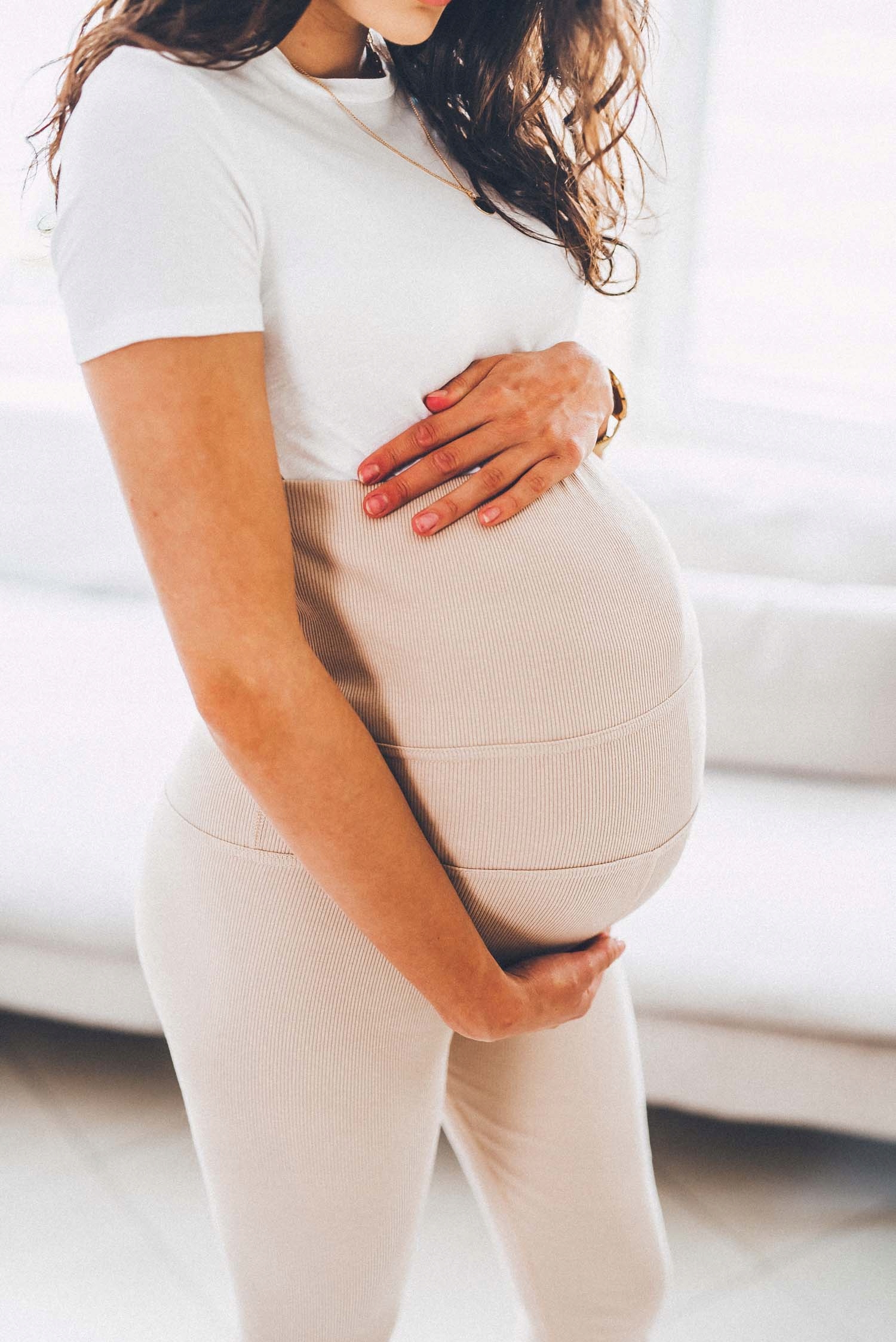 Леггинсы отделаны широким поясом, который облегает растущий живот будущей мамы.