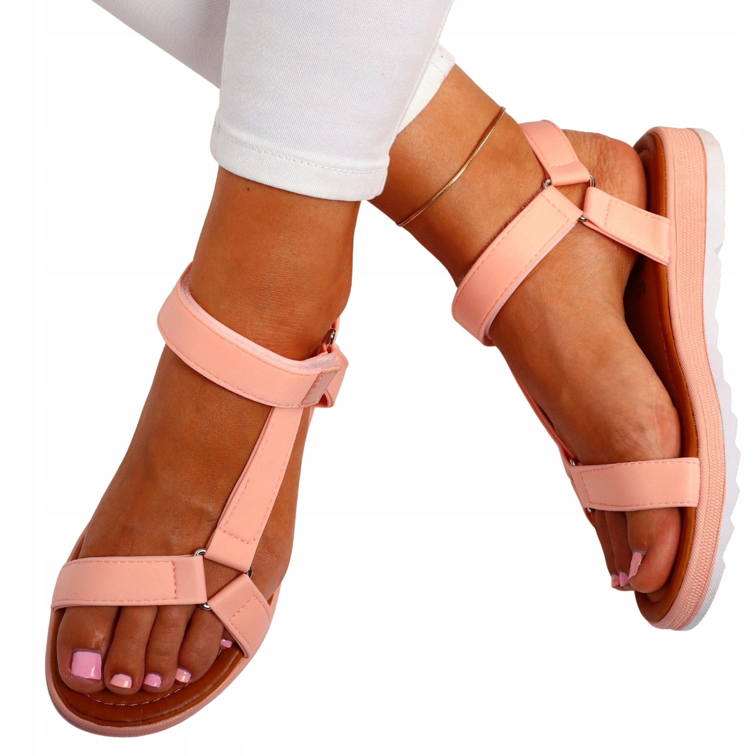 Женские розово-белые спортивные сандалии с плоским дном. Они идеальны в качестве повседневной обуви в жаркие летние дни. Ремешок на щиколотке с застежкой-липучкой позволяет легко надевать и регулировать ногу по разной ширине. Простой дизайн подойдет ко многим стилям.