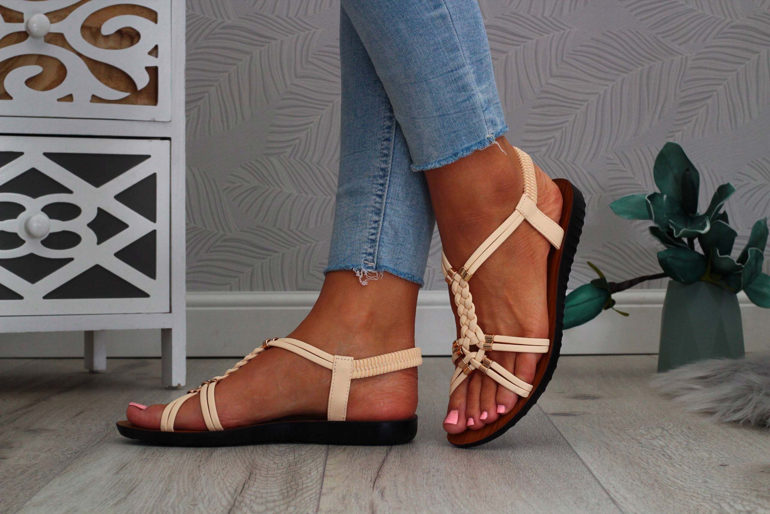 Женские бежевые сандалии на плоском дне. Идеально идеально подходит для обуви каждый день летом, жаркие дни. Simple Cut также адаптируется к элегантным стилизациям и декоративным, золотые бусы добавят очарование любой стилизации. Гибкий ремешок на пятке облегчает посадку на обувь и облегчает посадку на ногу.