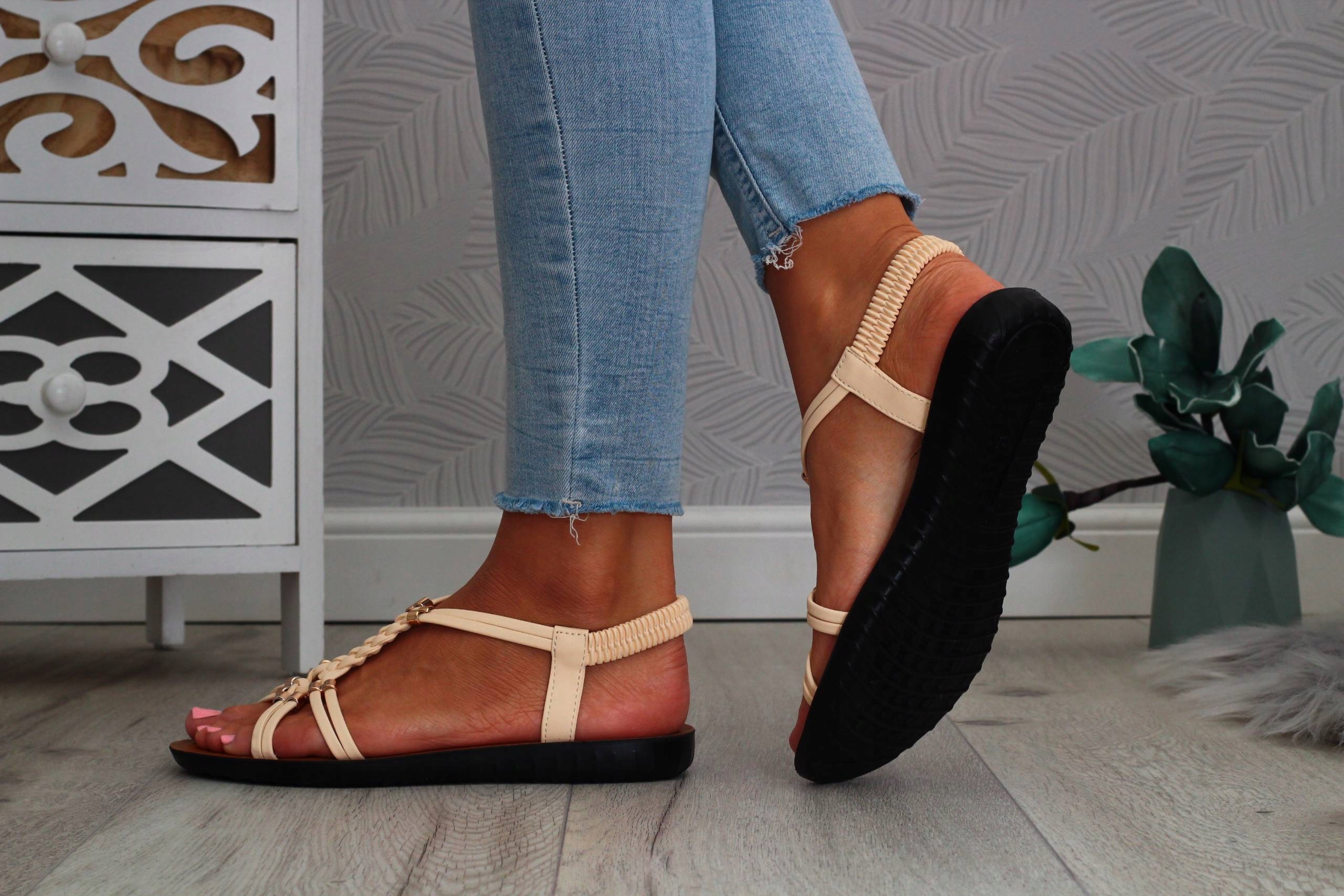 Женские босоножки бежевого цвета с плоским низом. Они идеальны в качестве повседневной обуви в жаркие летние дни. Простой дизайн также подойдет к элегантному стилю, а декоративные золотые бусины добавят очарования любому стилю. Эластичный ремешок на пятке облегчает надевание обуви и помогает подогнать ее по ноге.