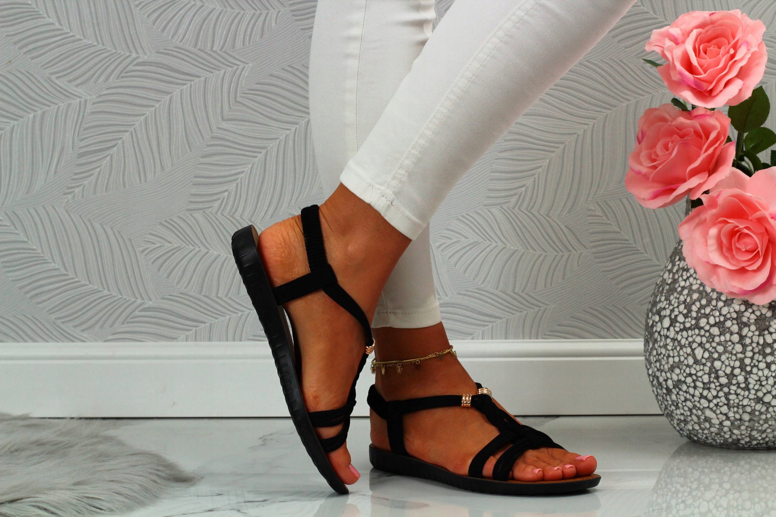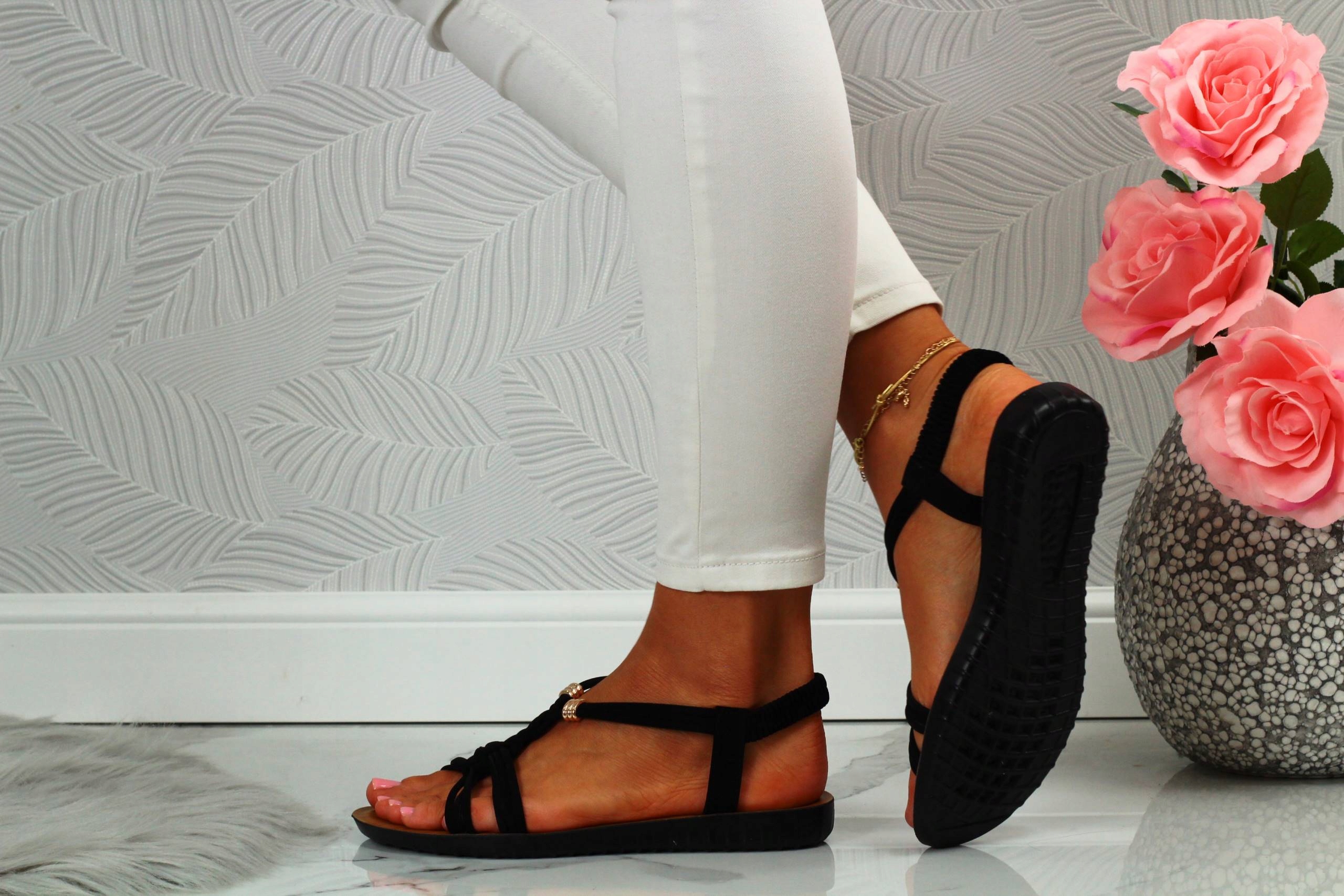 Женские черные босоножки с плоским низом. Они идеальны в качестве повседневной обуви в жаркие летние дни. Простой дизайн также подойдет к элегантному стилю, а декоративные золотые бусины добавят очарования любому стилю. Эластичный ремешок на пятке облегчает надевание туфель и регулировку по ноге.