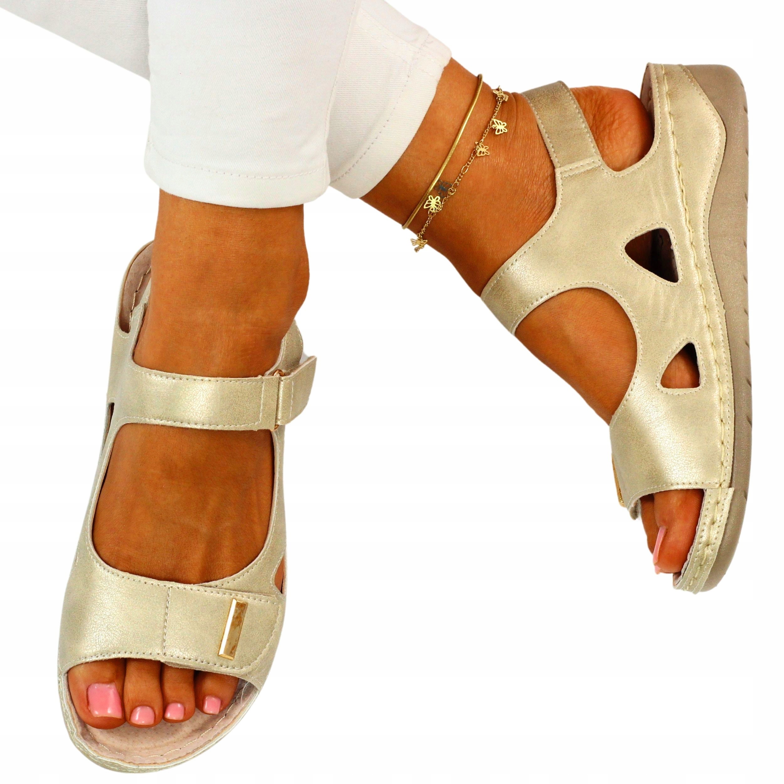 Женские бежевые босоножки на низкой танкетке. Они идеальны в качестве повседневной обуви в жаркие летние дни. Ремешки на липучке облегчают надевание обуви и ее регулировку по ноге. Профилированная кожаная стелька обеспечивает комфорт использования, а прошитая подошва увеличивает долговечность обуви.