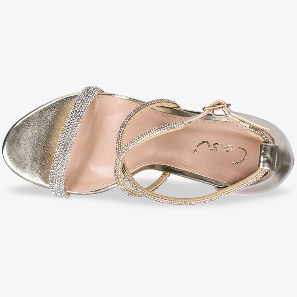 Золотые босоножки на блестящем высоком каблуке с обтянутым каблуком, перекрестными ремешками, стразами Casu D23X4-G