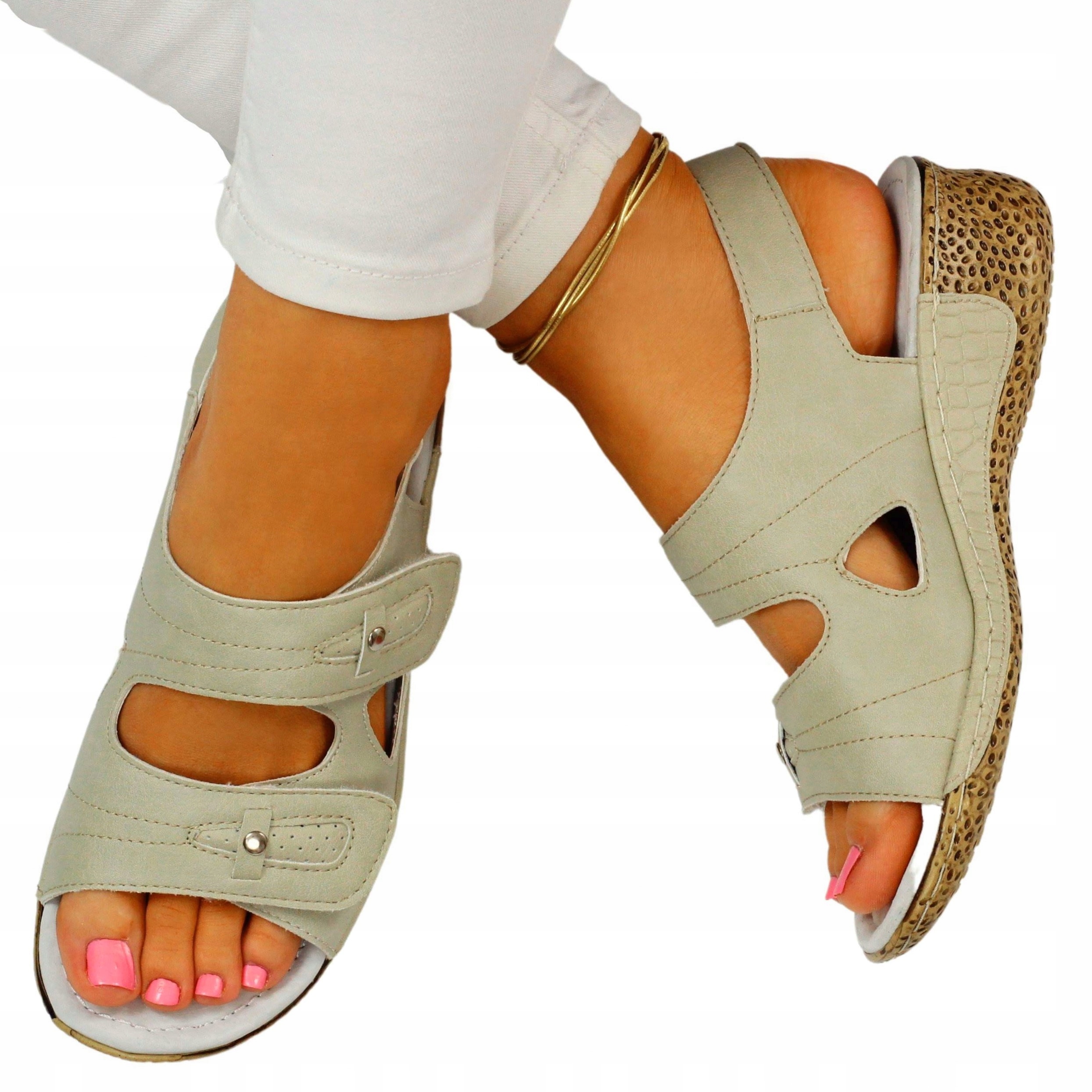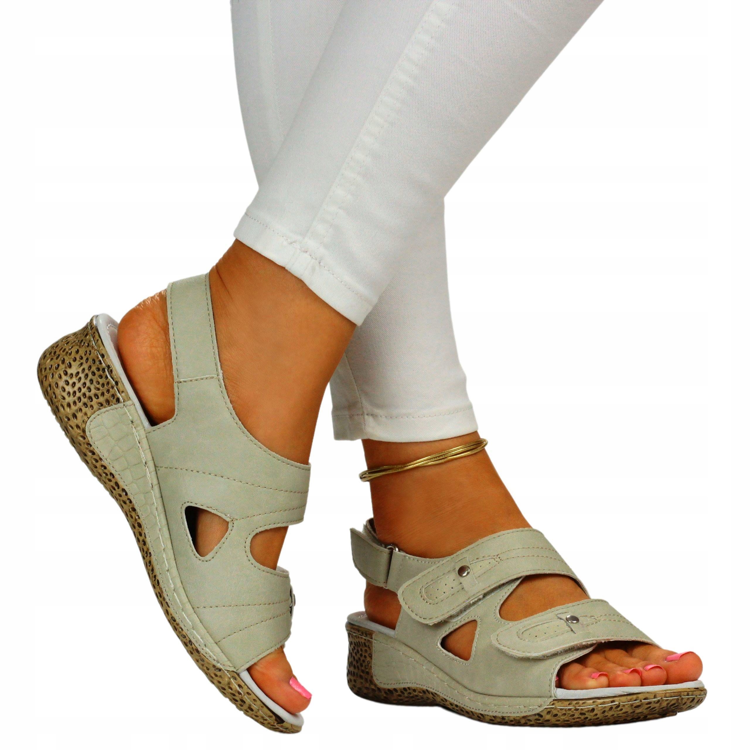 Босоножки женские бежевые на низкой танкетке. Застежка-липучка облегчает надевание обуви и позволяет регулировать ее. Мягкая кожаная стелька обеспечивает комфорт использования, а прошитая подошва обеспечивает более длительный срок службы обуви. Они идеальны в качестве повседневной или рабочей обуви.