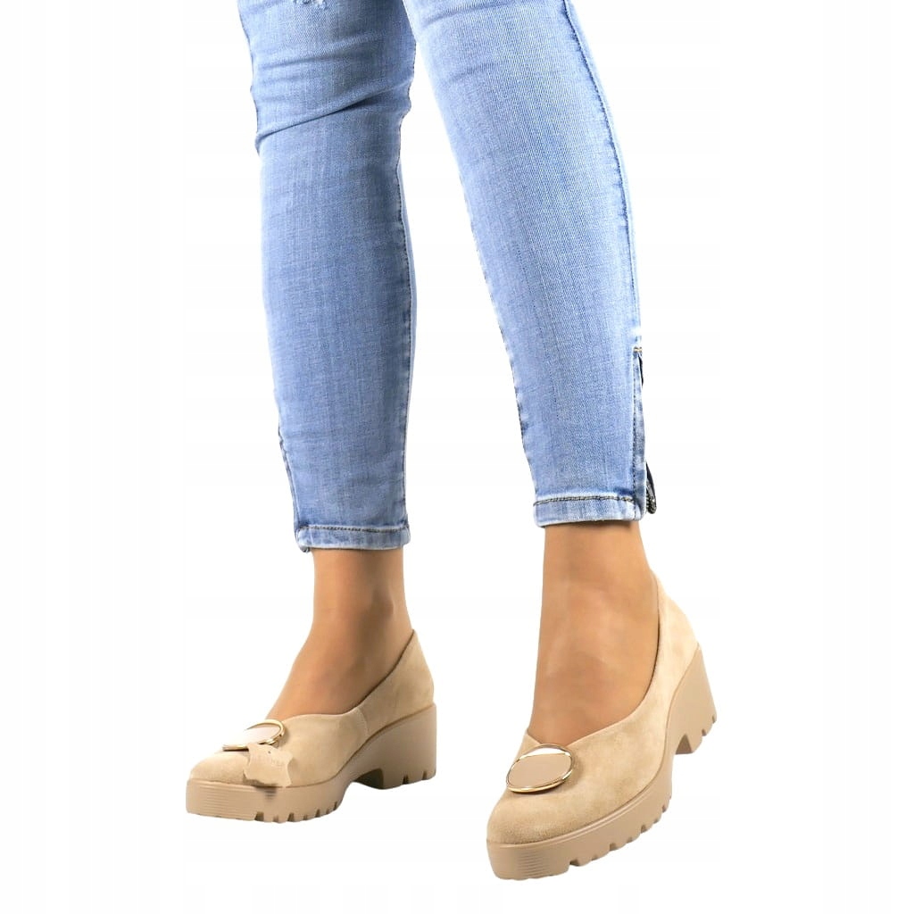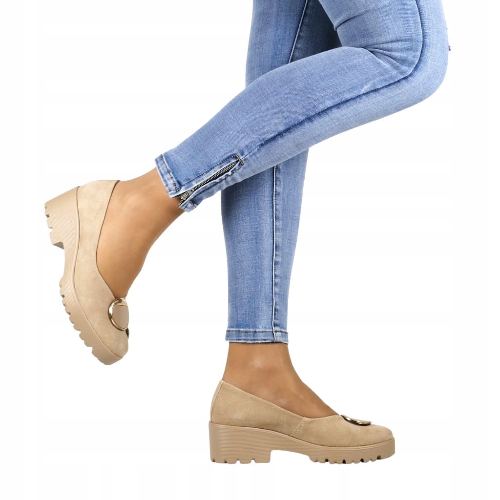 Элегантные женские туфли на танкетке выполнены из мягкой кожи. Внутри у них также есть кожаная вставка. Они отлично смотрятся как в праздничном, так и в повседневном исполнении. Замша красивого бежевого оттенка придает этим туфлям роскошный характер. Добавьте новое качество в свою коллекцию обуви и закажите прямо сейчас!